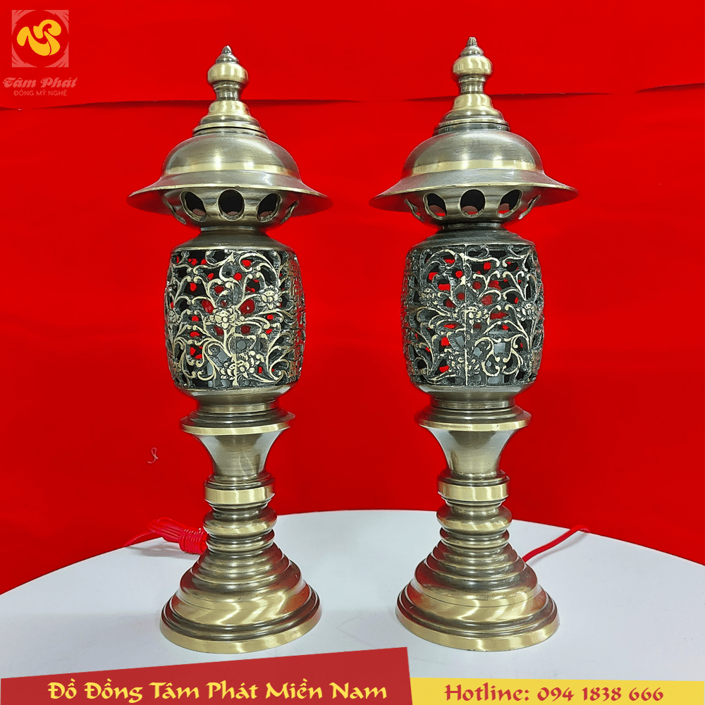 Bộ đồ thờ bằng đồng hai công nghệ chạm sòi gồm 5 phụ kiện chính: Đỉnh đồng, đôi hạc thờ, đôi chân nến bằng đồng, đều được làm từ đồng vàng nguyên chất và chế tác thủ công.