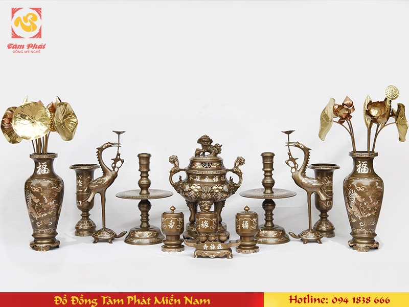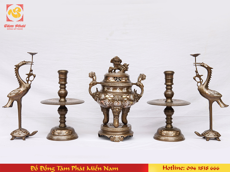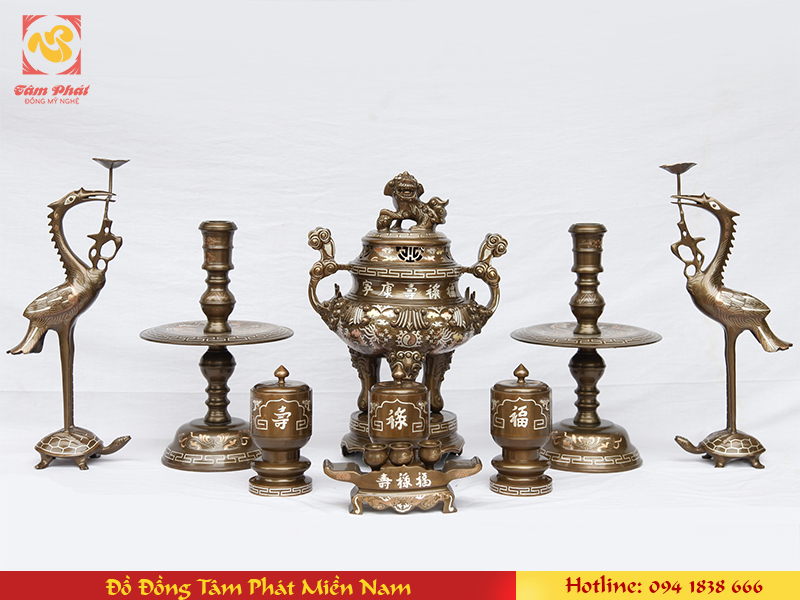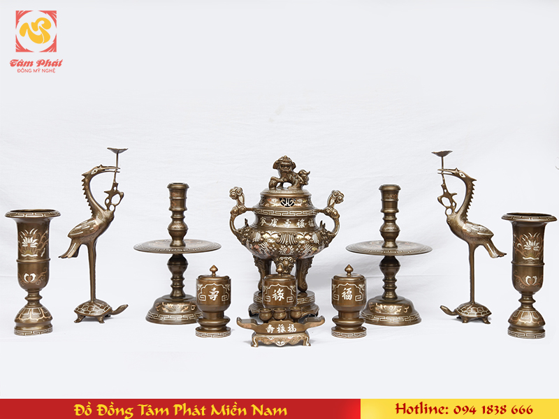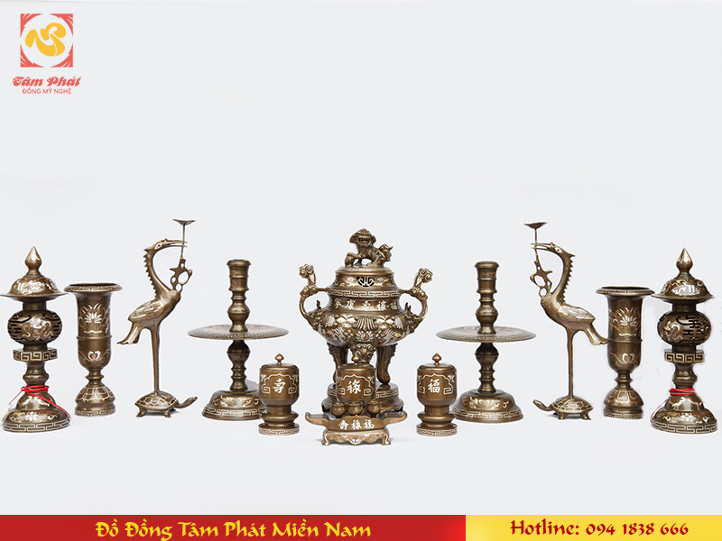 Một bộ sản phẩm đầy đủ bao gồm: Đỉnh đồng. Đôi nến. Đôi hạc thờ. Đôi lộc bình. Ống cắm hương. Chén nước. Đài. Đèn