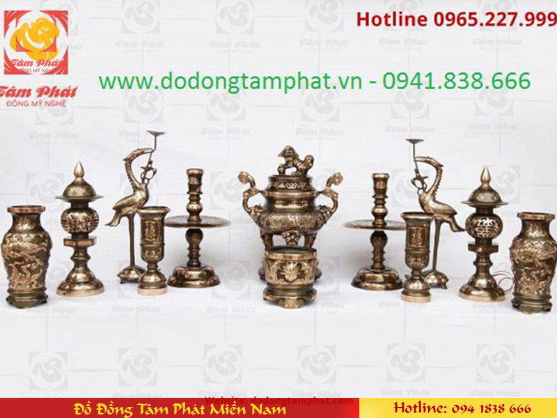 Bộ đồ thờ ngũ sự bằng đồng đỏ cạo màu kèm phụ kiện là bộ đồ thờ cúng linh thiêng, ý nghĩa rất được chạm đúc công phu, sâu sắc giá trị truyền thống. Tác phẩm được Tâm Phát chế tạo kì công từ đồng nguyên chất với hoa văn đầy tinh tế.