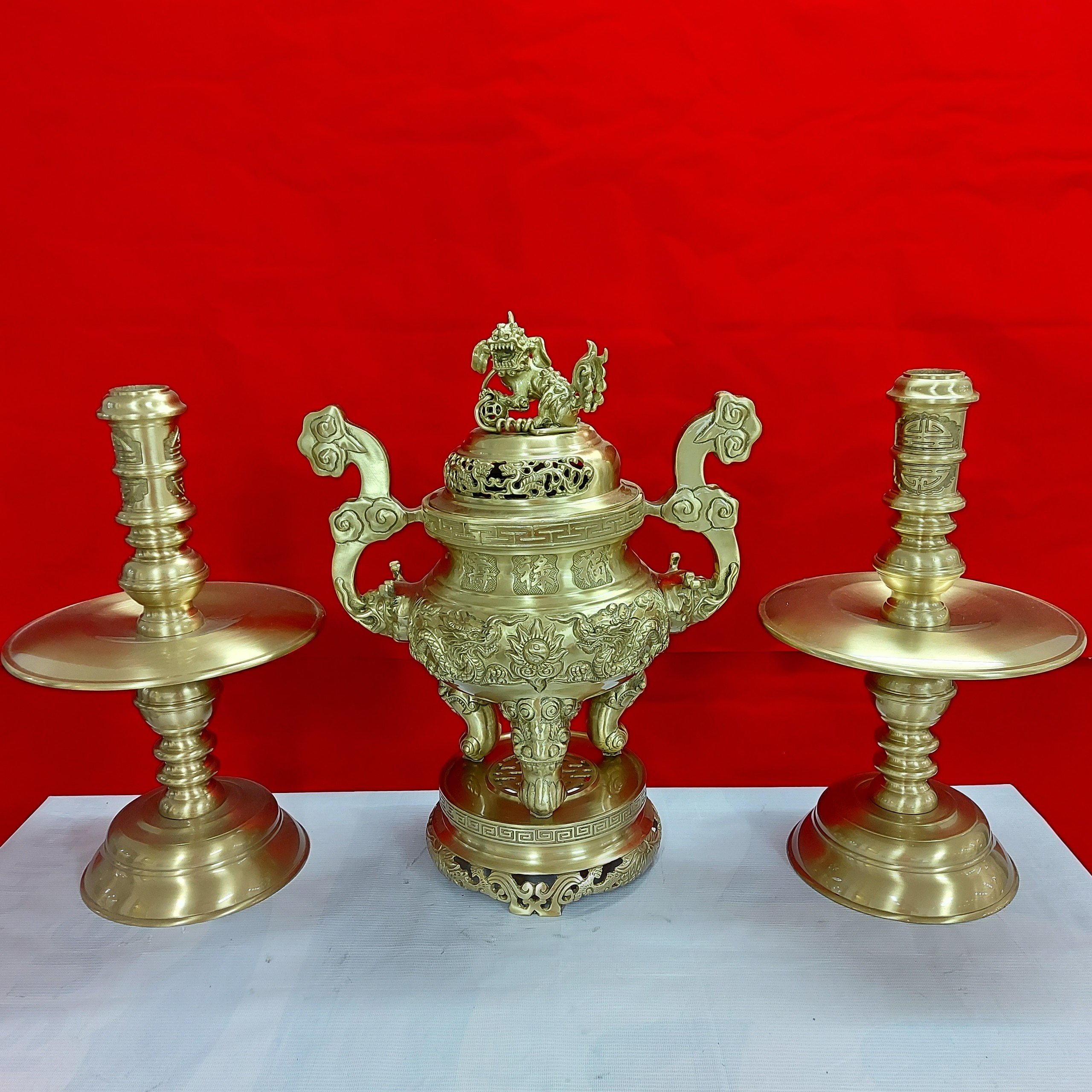Bộ lư đồng tam sự 40cm 3 món gồm đỉnh đồng cao 40cm, đôi chân nến bằng đồng cao 35 cm ( hoặc đôi hạc cao 43cm) phù hợp với kích thước ban thờ dài từ 70cm - 88cm. Đồ đồng thờ cúng tại Tâm Phát được phân phối chính hãng đến từ làng nghề đúc đồng truyền thống Vạn Điểm - Cái nôi nghề đúc đồng đem đến sản phẩm đặc biệt không cần chà bóng hàng năm, bảo hành sử dụng như mới không hoen gỉ, xuống màu tới 20 năm.
