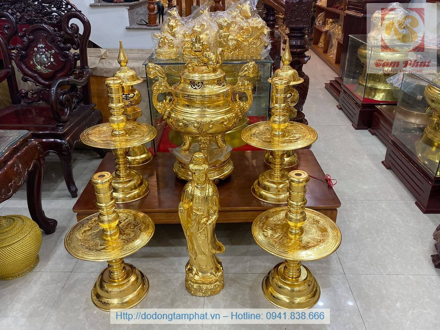 Mục đích sử dụng: Bộ tam sự bằng đồng đỏ mạ vàng cao 70cm là bộ đồ thờ cúng linh thiêng, ý nghĩa rất được ưa chuộng. Tác phẩm được Tâm Phát chế tạo kì công từ đồng nguyên chất