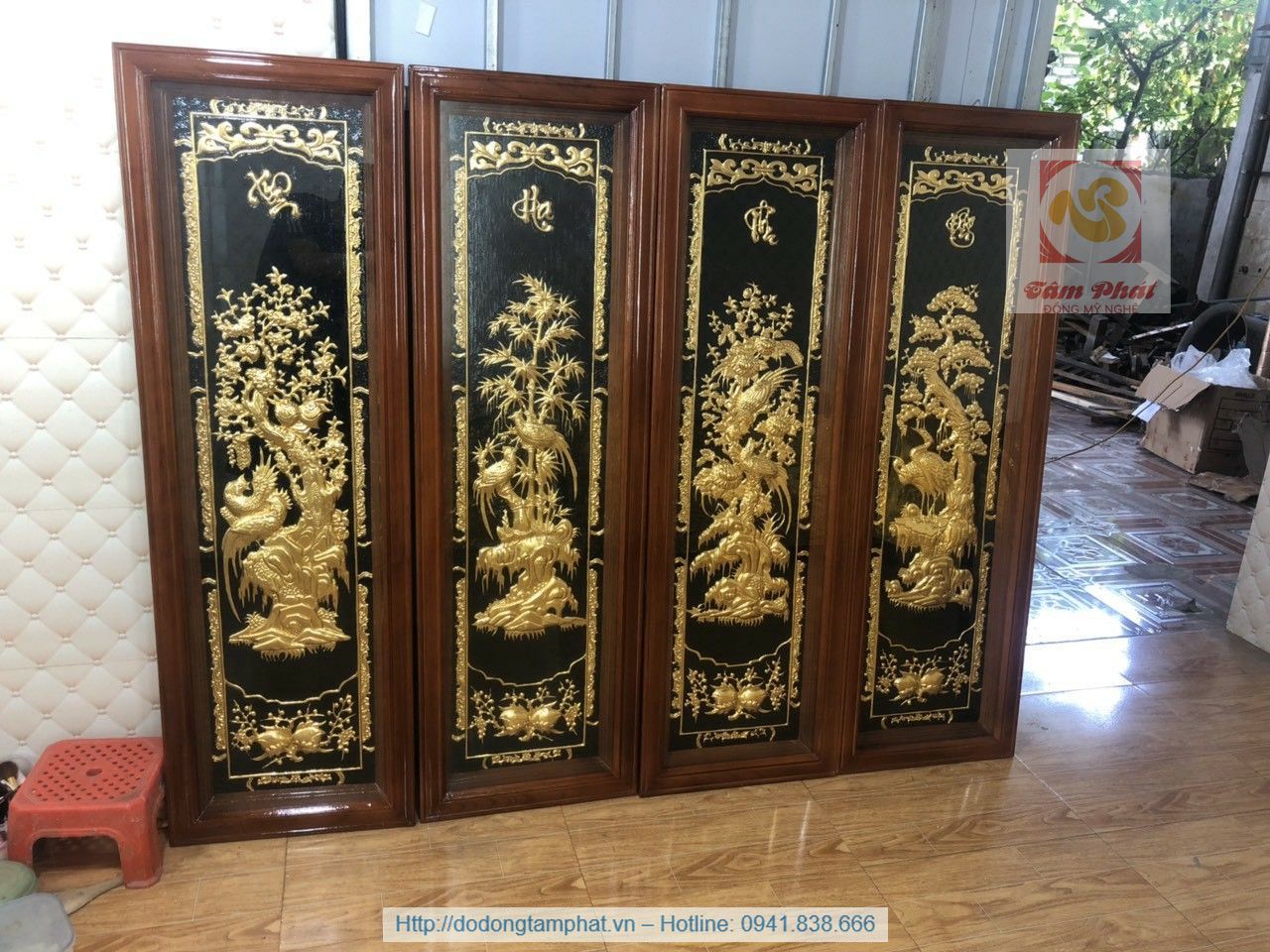 Bộ tranh bao gồm bốn bức rời. Chúng đều có kích thước là 40x110cm. Không những thế, cả bốn bức tranh cùng có khung gỗ - kính. Điều này tạo ra sự đồng nhất, tạo nên tính liên kết chặt chẽ. Ở đây, người nghệ nhân đã chạm cảnh Tùng - Cúc - Trúc - Mai. Vẻ đẹp và khí chất riêng của mỗi loài cây đều được thể hiện tỉ mỉ và chân thực. Ở cây Tùng, chúng ta thấy được sự hiên ngang, ngạo nghễ. Trong khi đó, gốc Mai lại đầy kiêu hãnh, duyên dáng. Những bông Cúc nở rộ vươn mình lên cao. Khóm Trúc lay động trong làn gió nhưng vẫn kiên cường.