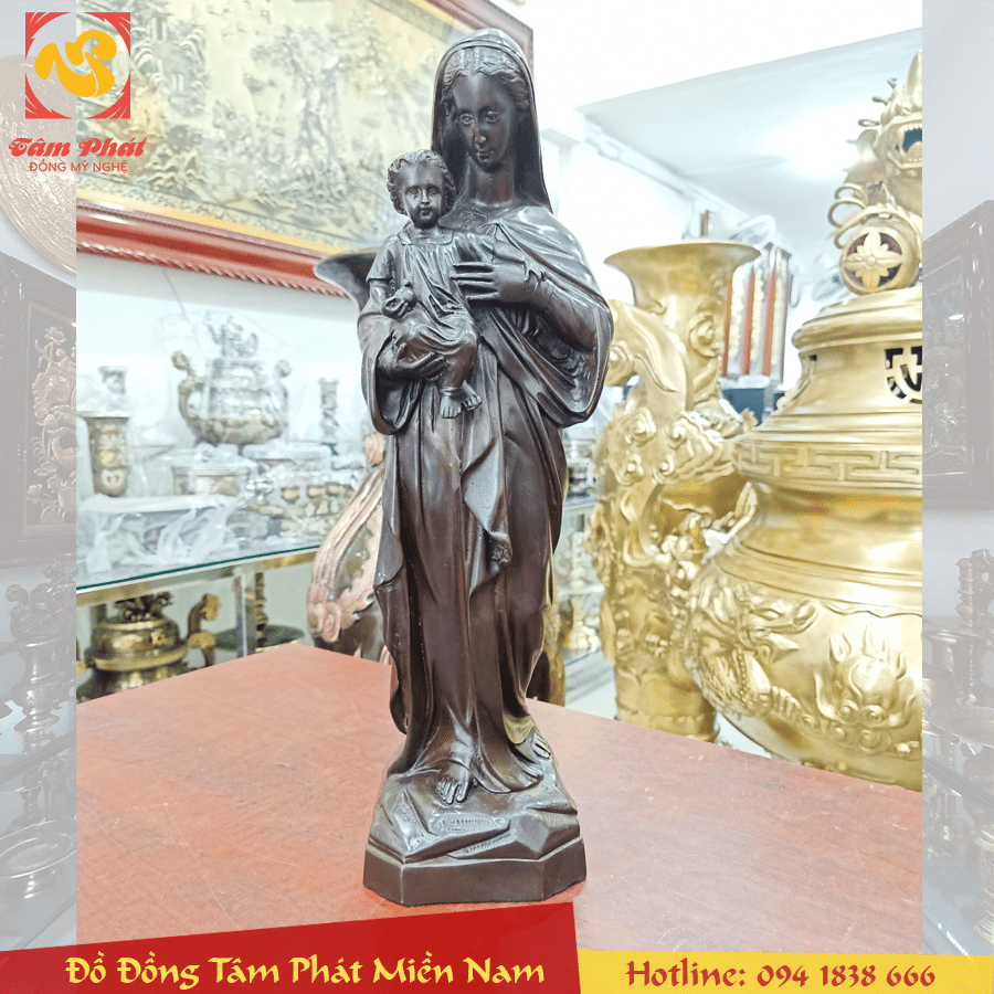 Mẫu tượng Đức mẹ bế Chúa được chế tác bằng đồng nguyên chất vì vậy mà đã tạo nên hệ màu vàng đồng rất đặc trưng và phù hợp.