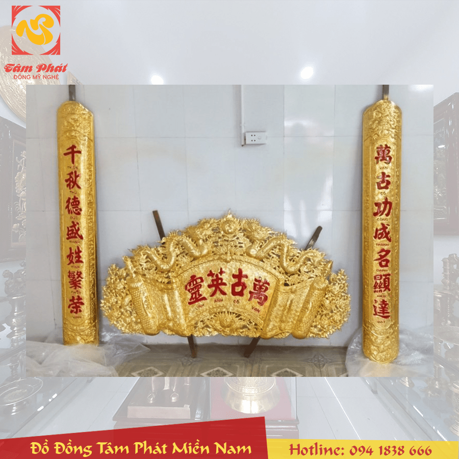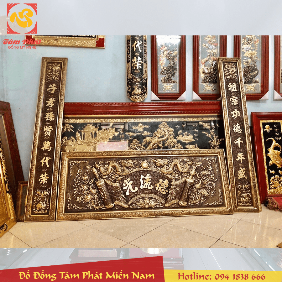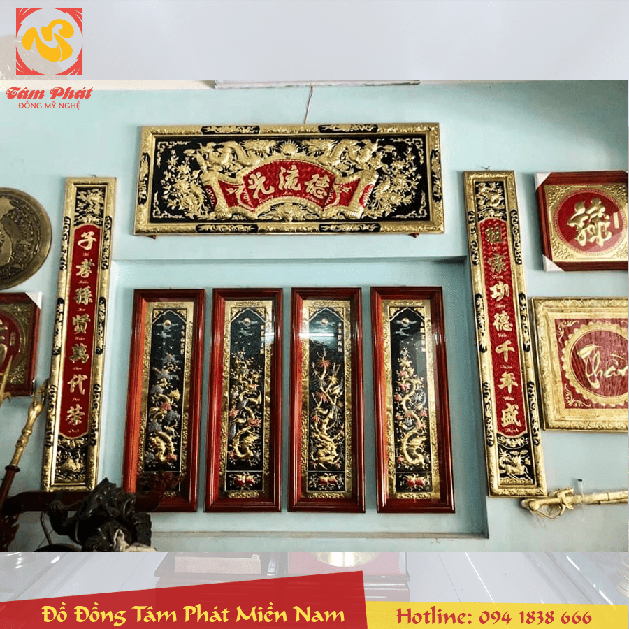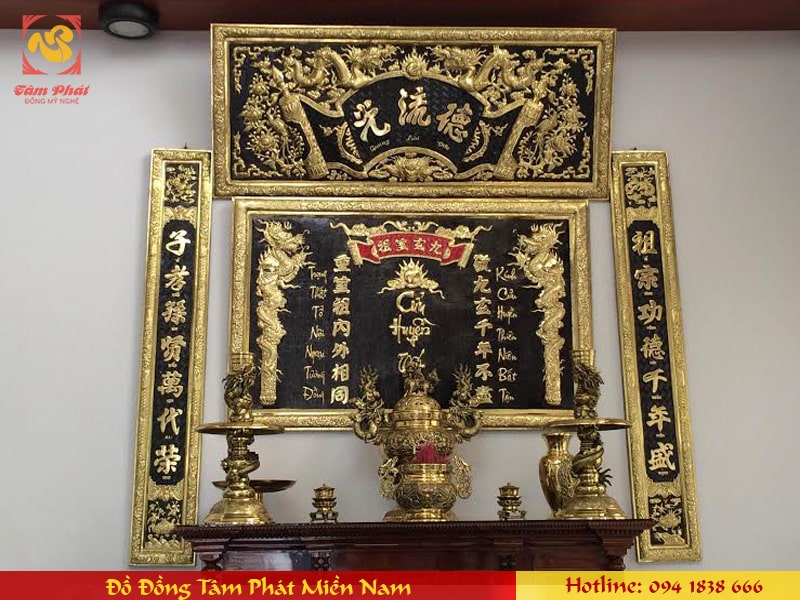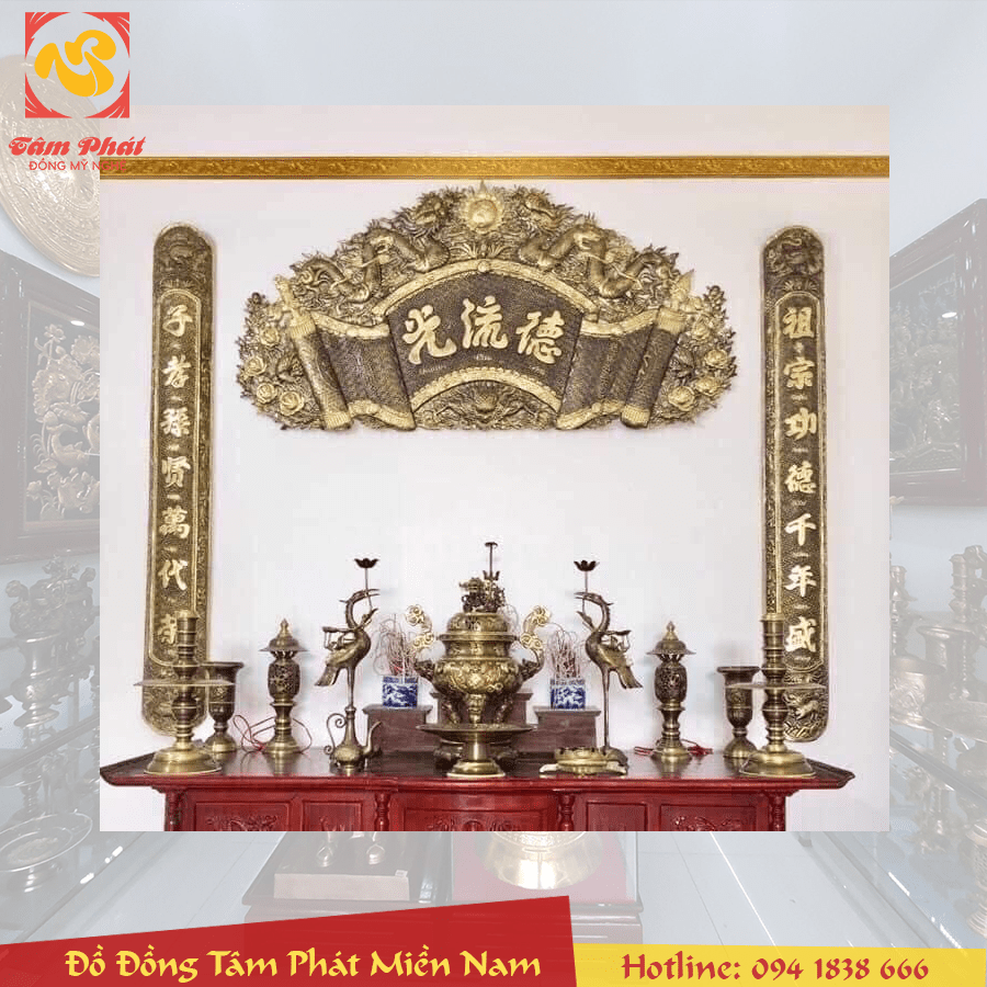 Đại tự Cuốn thư Câu đối Hoành phi tại Đồng Tâm Phát Miền Nam được làm bằng đồng thường mẫu hoa văn rất đẹp được chạm hoa văn thờ cúng theo kiểu xưa. Vì vậy sản phẩm rất được nhiều người yêu thích và chọn để trang trí bàn thờ gia tiên