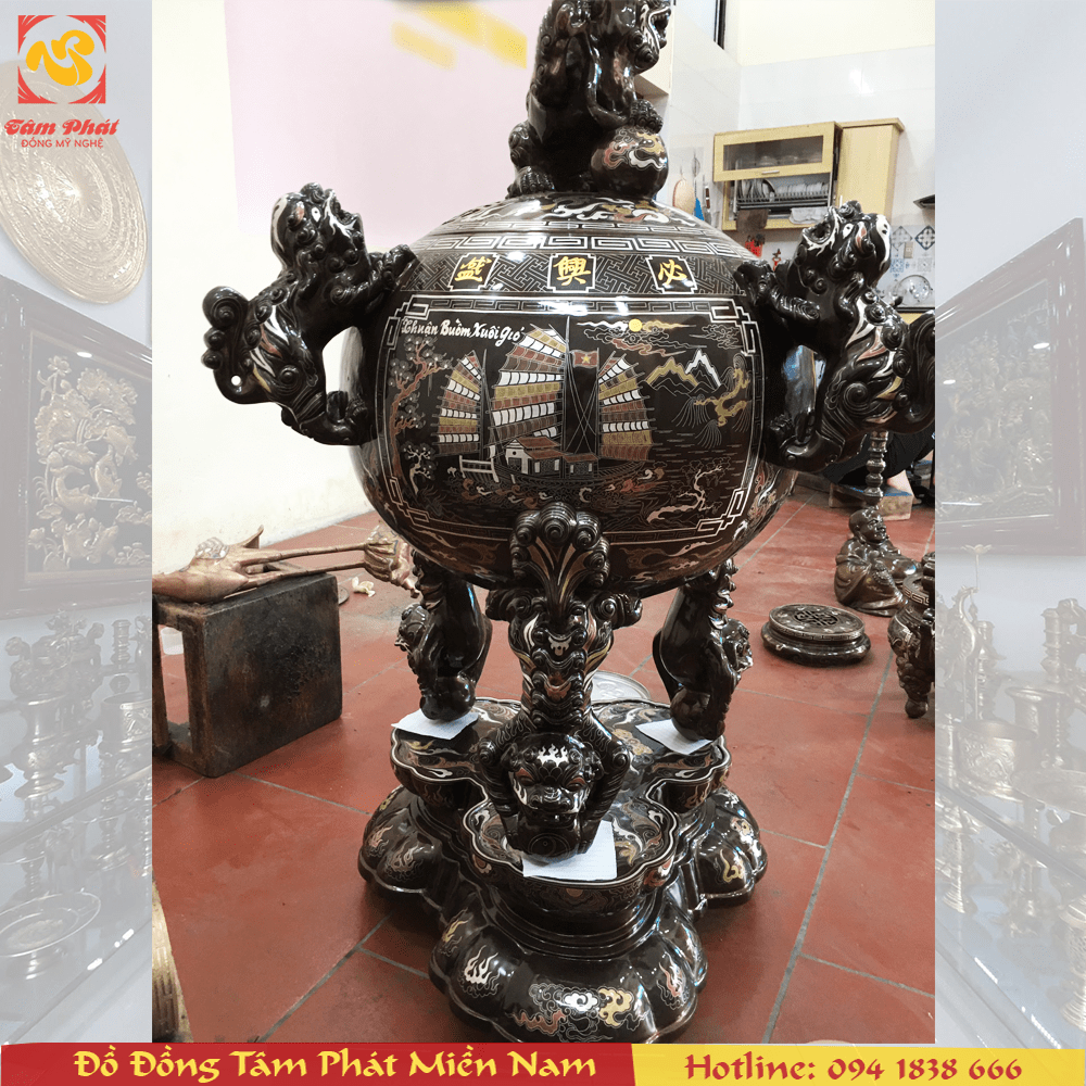 Thuận Buồm Xuôi gió sẽ mang lại sự may mắn trong làm ăn hay công việc luôn xuôi chèo mát mái thuận lợi. Với bố cục chặt chẽ, đường nét khảm tinh tấn, kết hợp với màu sắc cũng sự linh thiêng cát khí mạnh của vàng, bạc, đồng.... đỉnh thất lân vờn cầu này không chỉ là vật trang trí phòng khách sang trọng mà còn là vật phẩm phong thủy cực tốt cho gia chủ (là người làm ăn kinh doanh hay là quan chức, lãnh đạo). Đỉnh cao 1m1 nặng chừng hơn 100kg, được Tâm Phát đúc thủ công bằng đồng nguyên khối, khảm ngũ sắc tinh xảo, màu nền ốc bươu xanh cực đẹp và bền màu, bề mặt được phủ lớp dầu bóng trong suốt vừa làm bóng đẹp vừa giữa cho màu sắc bền với thời gian.