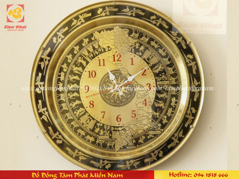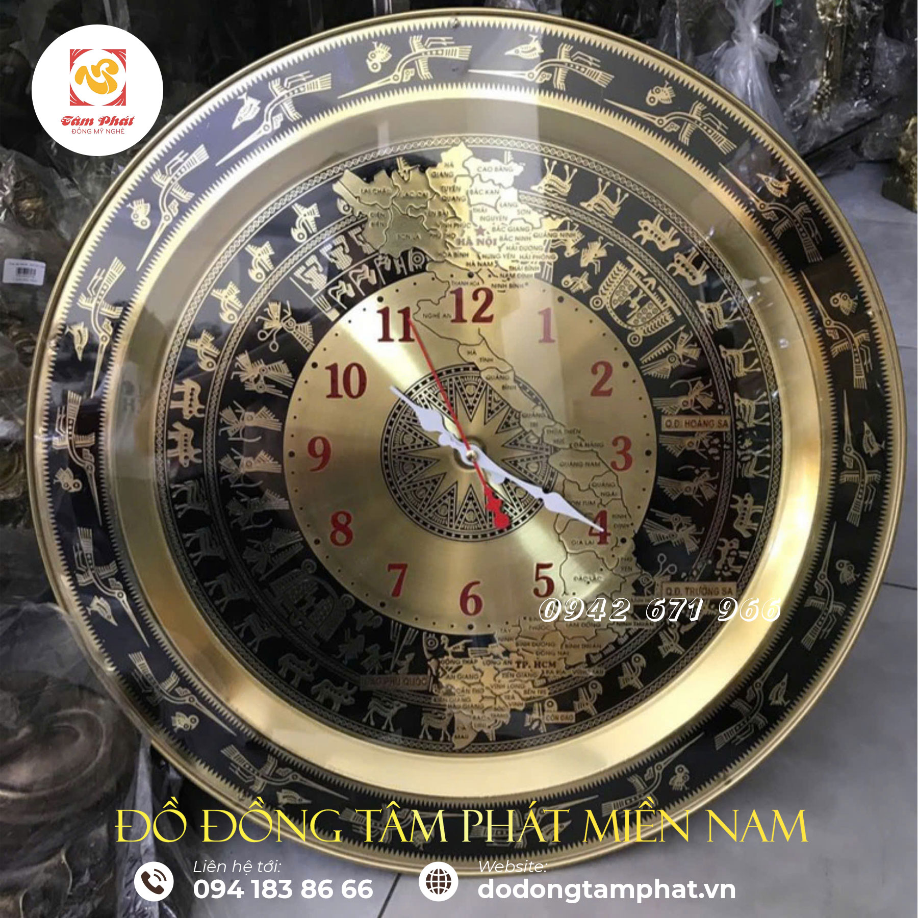 Mặt đồng hồ quà tặng hình trống đồng được làm với chất liệu đồng vàng nguyên chất, công nghệ làm ăn mòn, nền trong đồng hồ là hình ảnh bản đồ trọng tâm.