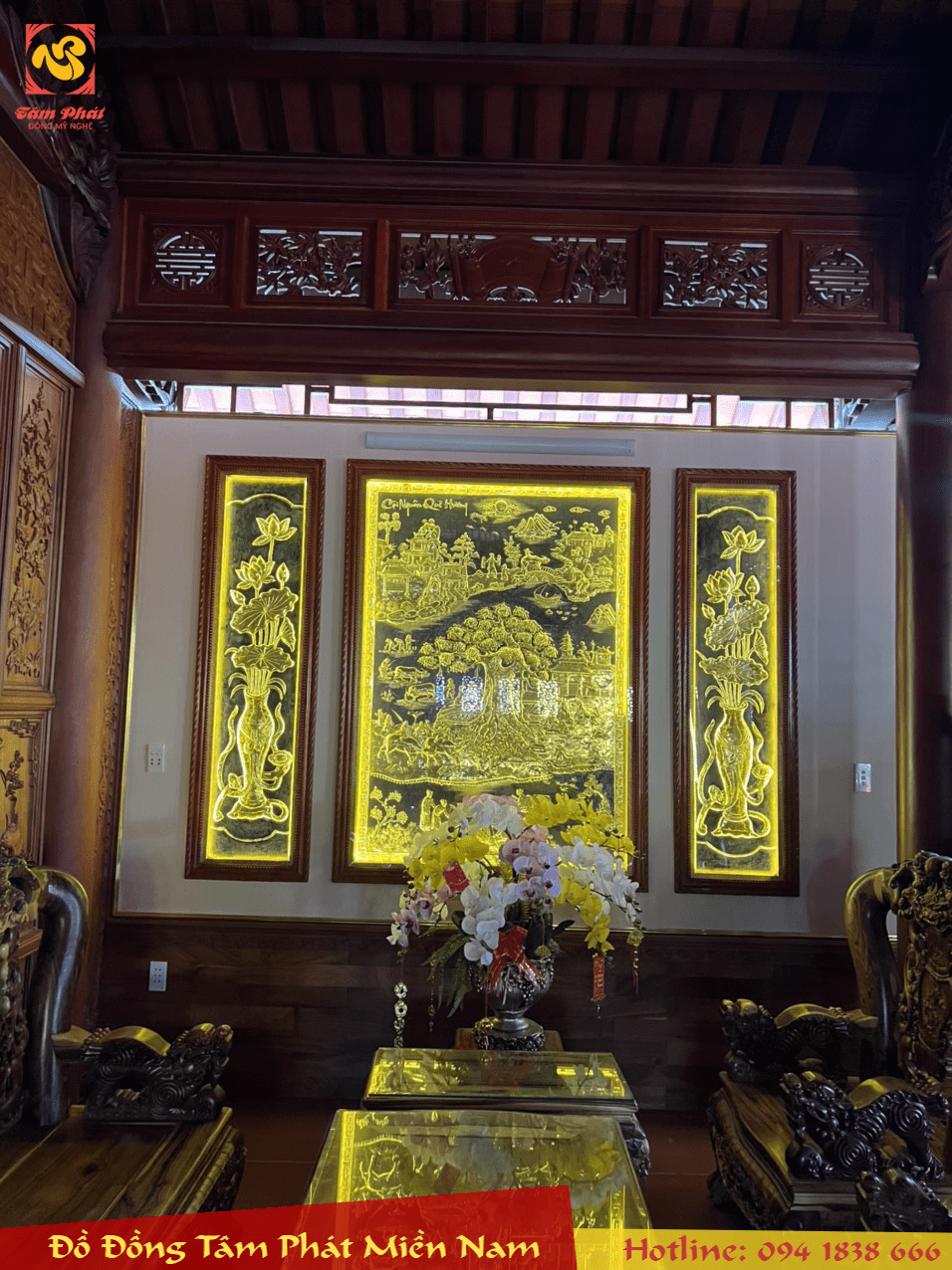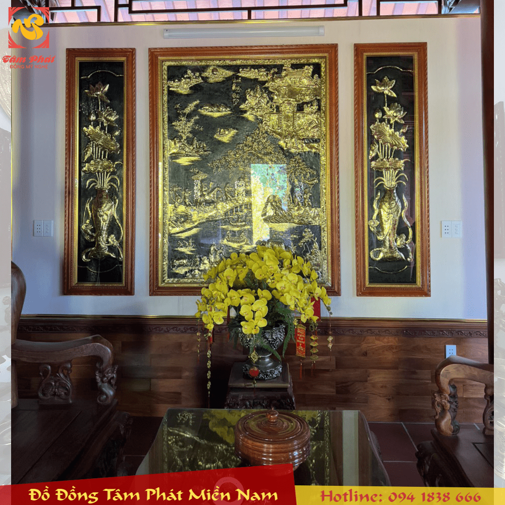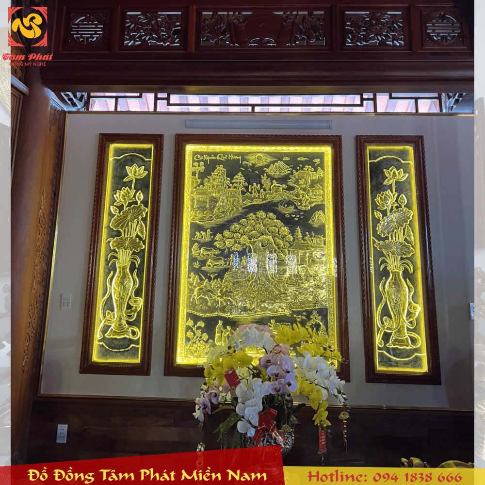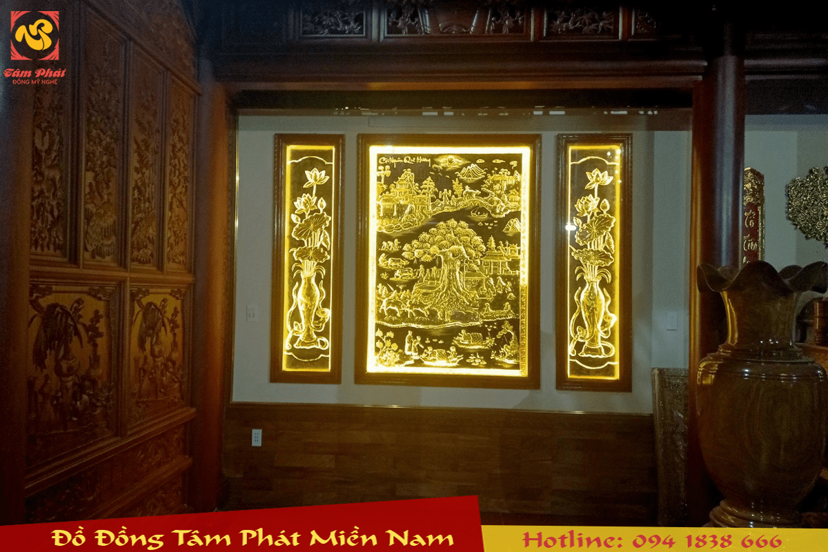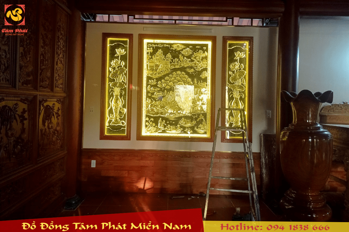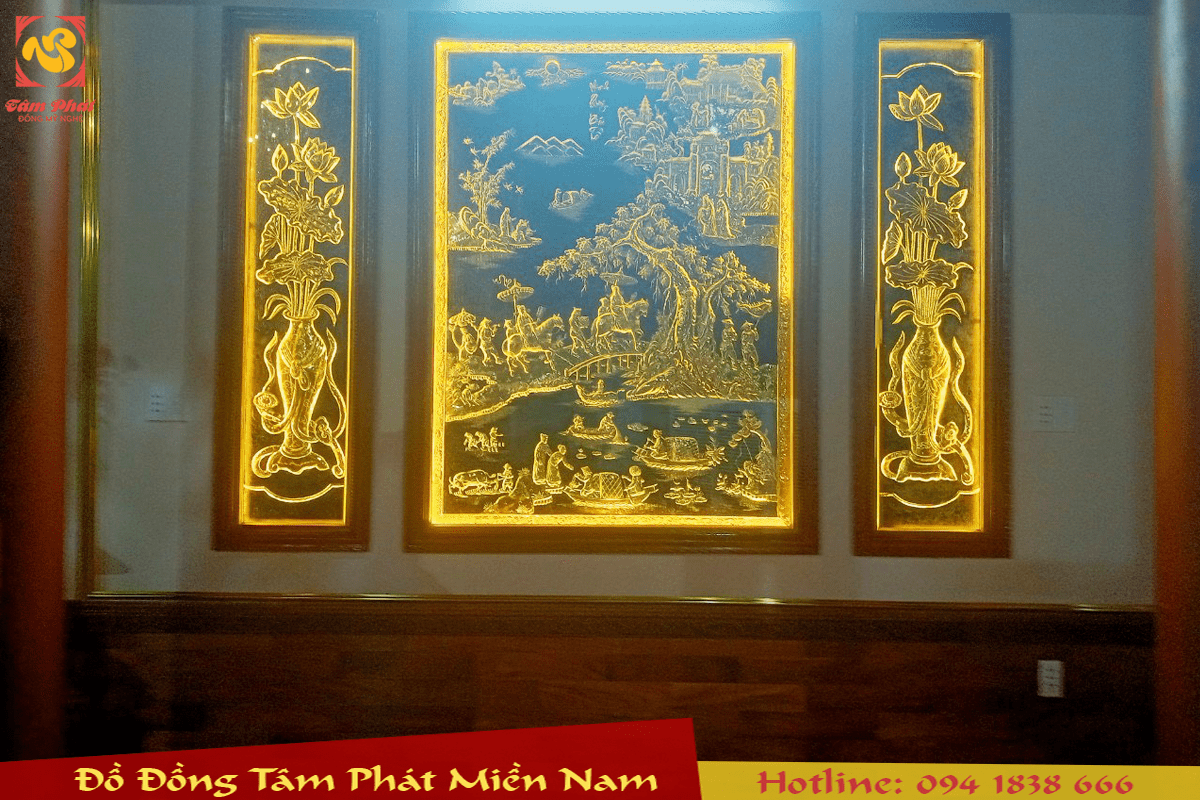 Tất cả đều được thúc tay thủ công nguyên khối, dày 1mm và mạ vàng 24k, khung gỗ, mặt kính, đèn led sinh động, sắc nét giúp cho không gian ngôi nhà thêm sang trọng, phú quý.