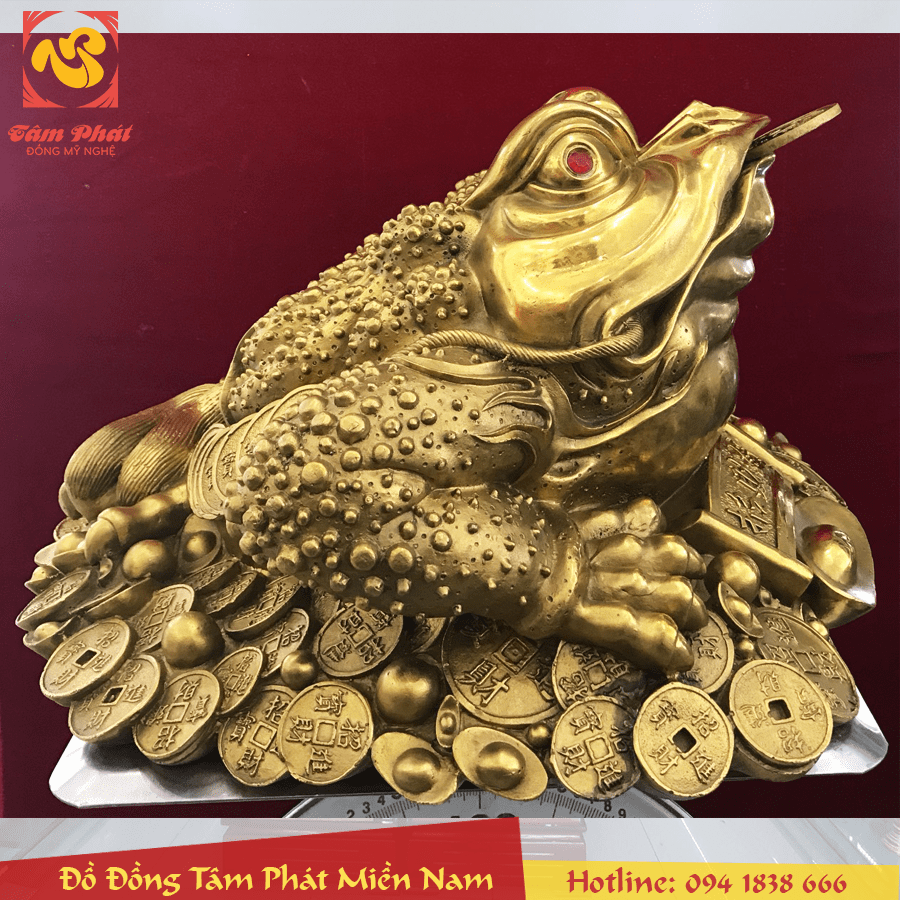 Cóc ngậm tiền với hình dáng con cóc ngồi trên đống tiền vàng, 2 chân ôm thỏi tiền lớn, miệng ngậm đồng tiền vàng, đuôi hóa thành chân sau. Trong phong thủy, cóc 3 chân là linh vật phong thủy có biệt tài nhả ra tiền nên có khả năng chiêu tài rất mạnh.