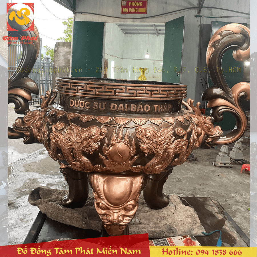 Ở đây, vầng nguyệt tỏa ra những tia sáng mạnh mẽ. Phần bên trong có hình thái cực âm dương cân bằng. Mặt chính diện của lư hương còn được chạm dòng chữ trang nghiêm : “Dược Sư Đại Bảo Tháp”. Hai bên thân lư có hình đầu rồng – một quay sang phải, một quay sang trái. Miệng rồng phun ra dòng nước. Nó uốn lượn như một cành lá với đường nét mềm mại. Món đồ thờ bằng đồng này sở hữu thế đứng kiên cố với ba chân trụ. Chúng mang tạo hình của Kỳ Lân. Linh thú có chiếc sừng nhô lên từ đỉnh đầu, móng vuốt sắc nhọn. Bệ đỡ của lư hương cũng rất tinh xảo. Mặt trên cùng được chạm rỗng chữ Thọ triện. Mặt cạnh chạm nổi hình rồng trong mây.