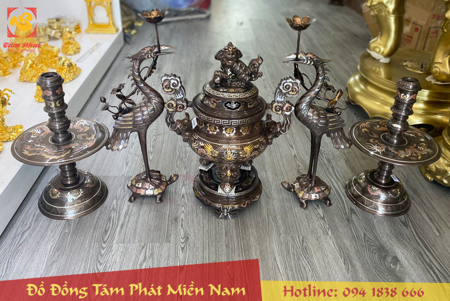 >>> Bộ đồ thờ đầy đủ gồm: Bộ đỉnh đồng tam sự, bộ đỉnh đồng ngũ sự, bát nhang, mâm hoa quả, đài nước, lọ hoa đồng tiền và hoành phi câu đối,…