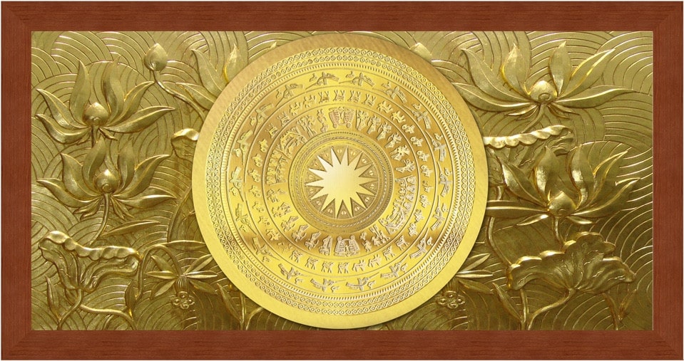 Mặt trống đồng phong thủy được chạm khắc hoàn toàn thủ công trên miếng đồng vàng nguyên chất với các từng chi tiết dù là nhỏ nhất cũng đều góp phần làm nên nét độc đáo, tinh tế của mặt trống đồng Ngọc Lũ.