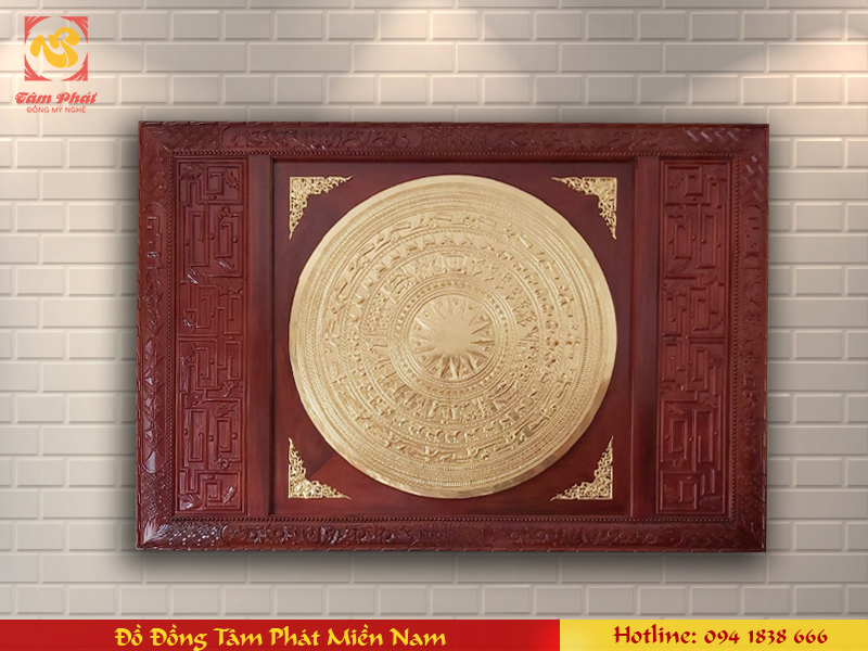 Mặt trống đồng đường kính 1m khung gỗ gụ dài 2m2 là sản phẩm nghệ thuật cao cấp, tinh xảo về mặt trống đồng Việt Nam được khắc họa công phu, sâu sắc giá trị văn hóa. Tác phẩm được Tâm Phát chế tạo kì công từ đồng nguyên chất với khung gỗ tinh xảo.