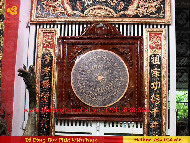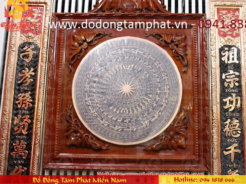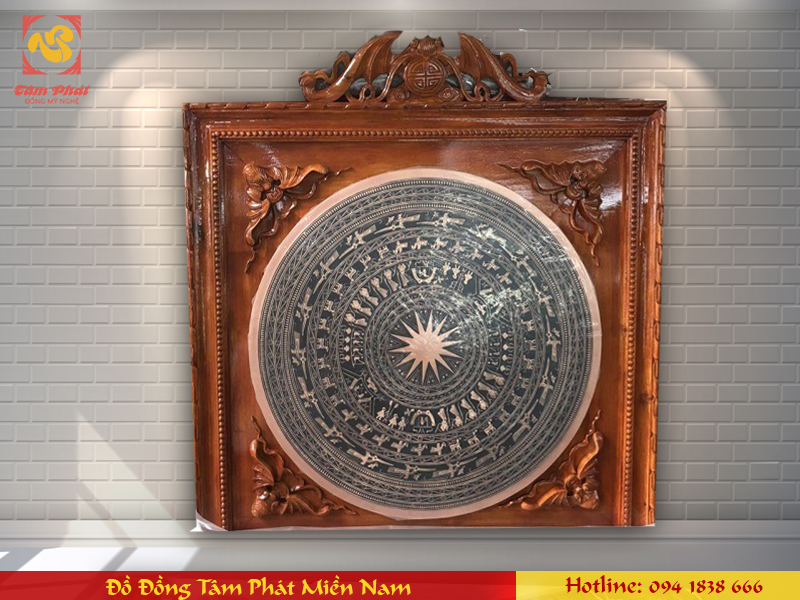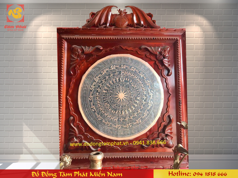Mặt trống đồng đường kính 50cm khung gỗ Phúc thử là sản phẩm nghệ thuật cao cấp, tinh xảo về mặt trống đồng Việt Nam được khắc họa công phu, sâu sắc giá trị văn hóa. Tác phẩm được Tâm Phát chế tạo kì công từ đồng nguyên chất với khung gỗ tinh xảo.