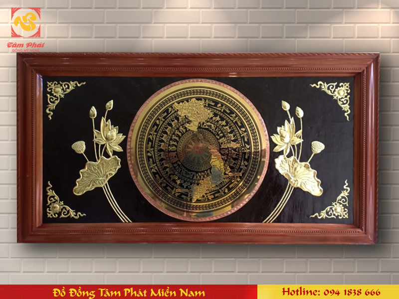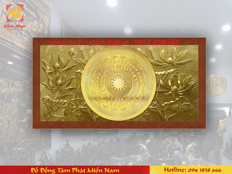 Mặt trống đồng mạ vàng 24k nền hoa sen là sản phẩm nghệ thuật đẹp về mặt trống đồng Việt Nam được khắc họa công phu, sâu sắc ý nghĩa phong thủy. Tác phẩm được Tâm Phát chế tạo kì công từ đồng nguyên chất và hoa văn tinh tế.