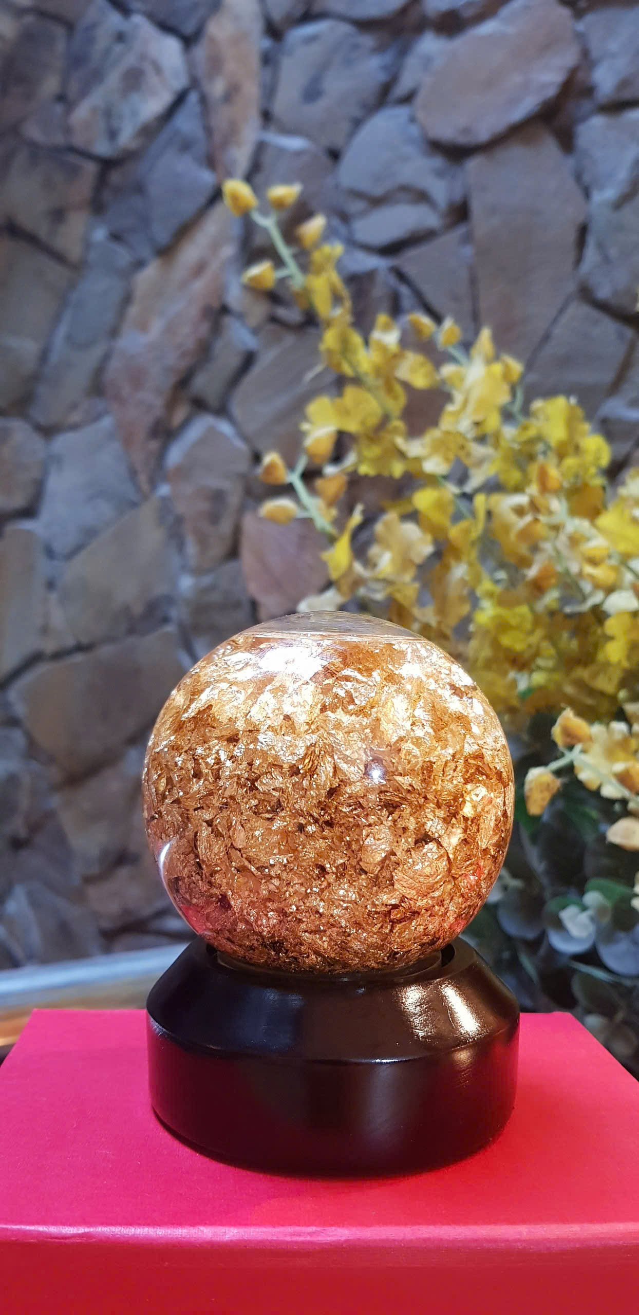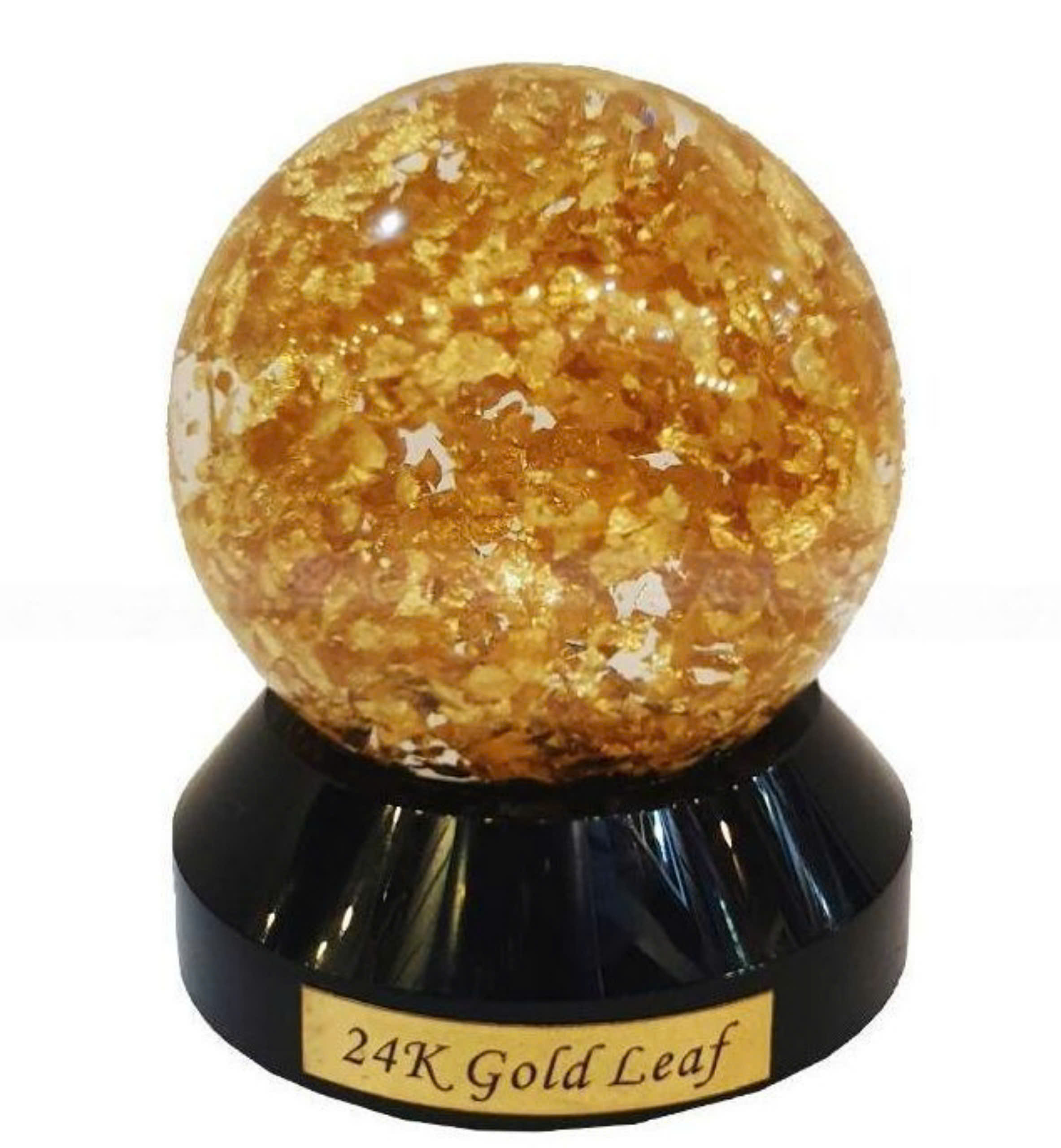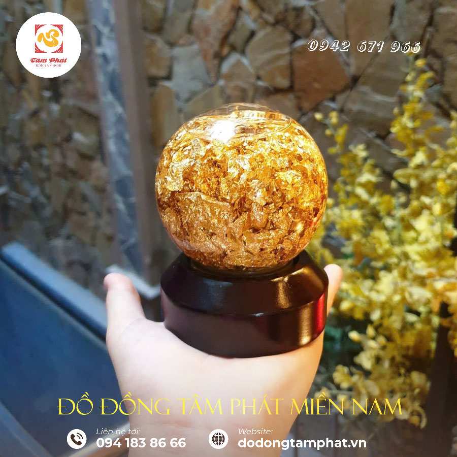 Điều đặc biệt của quả cầu pha lê là bên trong là những lá vàng lơ lửng trong môi trường tinh dầu phát ra ánh sáng của tài lộc và quý phái sang trọng.