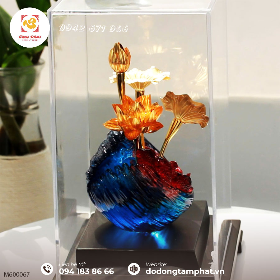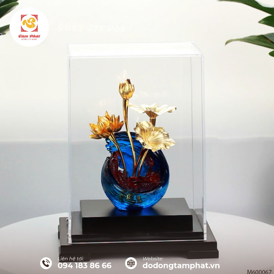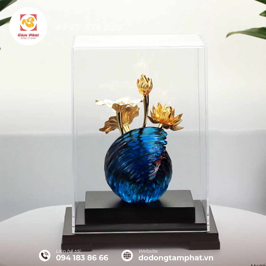 Sản phẩm chậu hoa sen của Tâm Phát thể hiện hình ảnh của những bông hoa, lá hoa đang kiêu hãnh vươn lên khoe sắc, trên những làn sóng lăn tăn. Những cành hoa và lá sen dát vàng 24K được chế tác dưới bàn tay khéo léo của người nghệ nhân với những đường viền trên cánh hoa và gân lá vô cùng mềm mại, tự nhiên. Chậu sen được đặt trên đế chắc chắn lấy cảm hứng từ cánh sóng xanh biếc càng làm toát lên vẻ sang trọng, đẳng cấp sẽ là điểm nhấn mạnh mẽ cho không gian trưng bày.