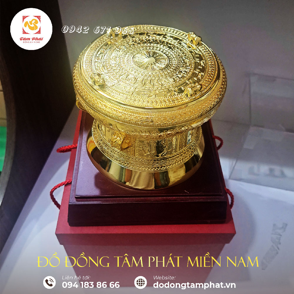 Trống đồng lưu niệm mạ vàng 24k là sản phẩm quà tặng được Tâm Phát chế tạo kì công từ đồng nguyên chất với hoa văn đầy tinh tế. Quà tặng trống đồng Ngọc Lũ mạ vàng được ưa chuộng trưng bày trong phòng làm việc, phòng khách với ý nghĩa phong thủy sâu sắc.