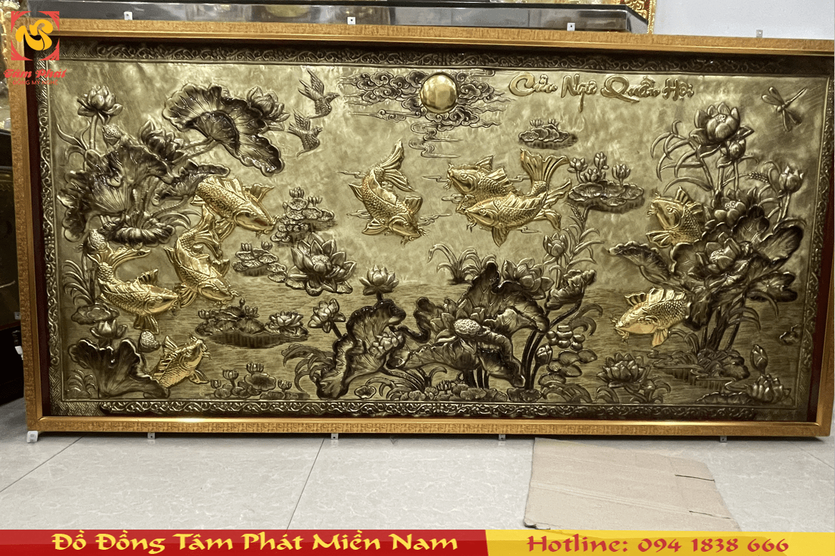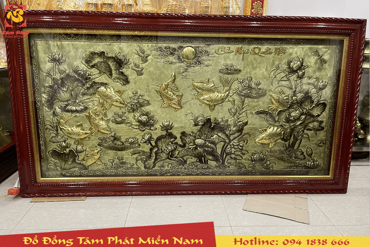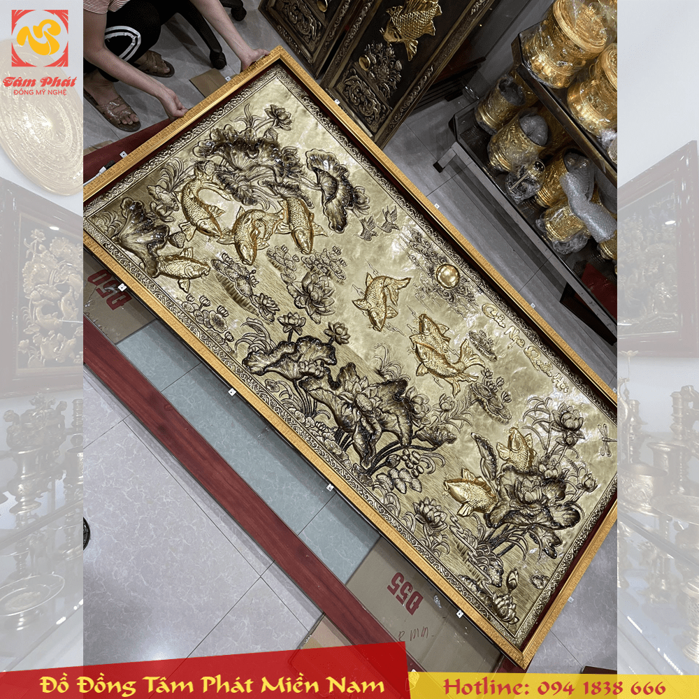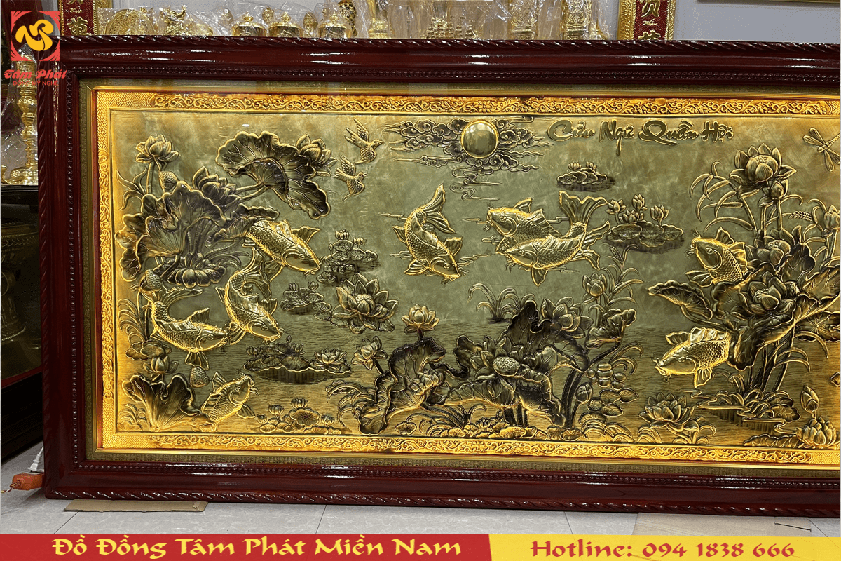Tranh đồng cửu ngư quần hội là bức tranh với nét hoa văn tinh tế không chỉ tô điểm không gian mà còn có công năng về phong thủy, thu hút năng lượng tốt, được làm hoàn toàn thủ công bởi đôi bàn tay tài hoa của các nghệ nhân, thợ thủ công lâu năm trên đồng vàng nguyên tấm dày 1 ly, bề mặt được tạo màu xước giả cổ vô cùng đẹp, khung tranh bằng gỗ tự nhiên màu cánh gián.