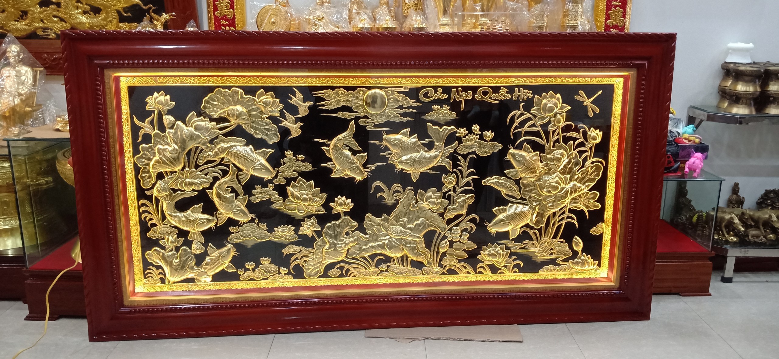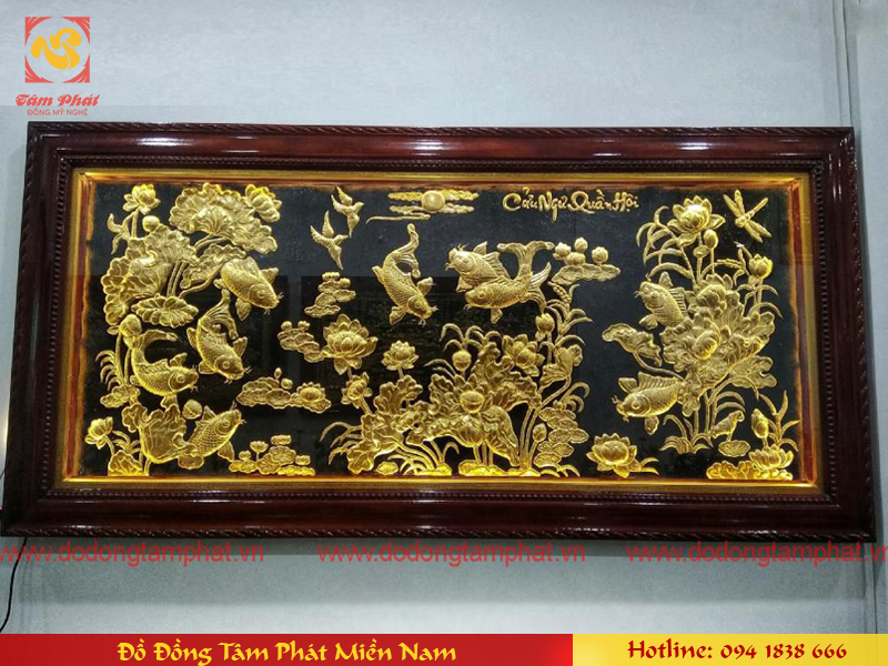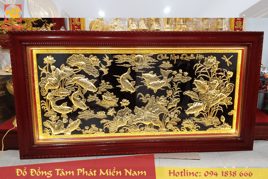 Bức tranh Cửu Ngư Quần Hội bao gồm chín con Cá Chép bơi lội trong đầm sen là một bức tranh mang nhiều vẻ đẹp và ý nghĩa trong phong thủy. Bức tranh được dát vàng 9999 sắc nét tinh xảo thích hợp treo tại phòng khách, văn phòng công ty, hội trường.