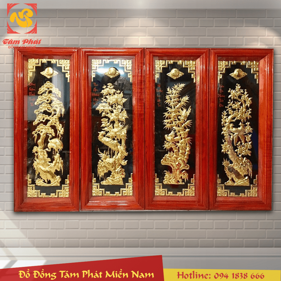 Tranh Tú Quý Bình An bằng đồng vàng vẽ màu