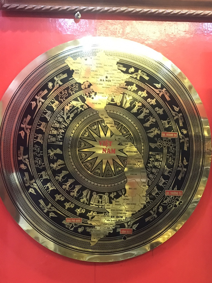 Quà tặng bằng đồng mặt trống đồng đông sơn ăn mòn với mặt trống đồng vàng ăn mòn bản đồ Việt Nam đường kính có sẵn là 60cm 80cm 90cm 120cm 150cm... các bản mặt trống có kích thước khác nhau quý khách hàng yêu cầu mặt trống bản đồ hoặc không bản đồ.