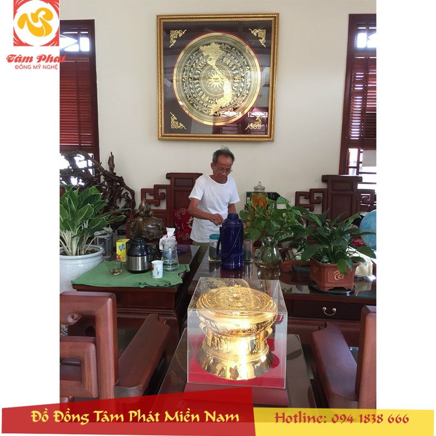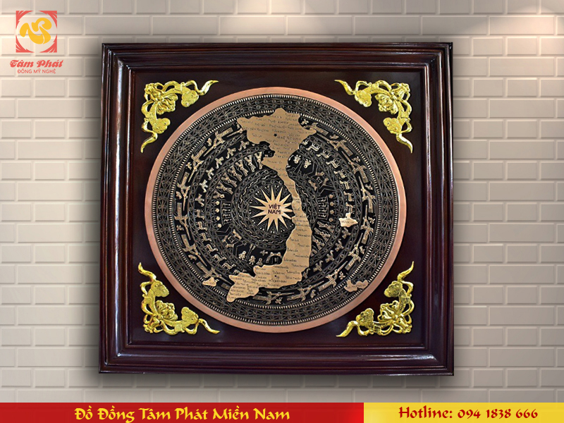 Tranh trống đồng Bản đồ Việt Nam khung gỗ mạ vàng được sản xuất bởi Cơ sở Tâm Phát tinh xảo thường được dùng làm quà tặng bạn bè đối tác và trưng bày treo phòng khách, phòng họp hoặc trong cơ quan với ý nghĩa phong thủy sâu sắc.