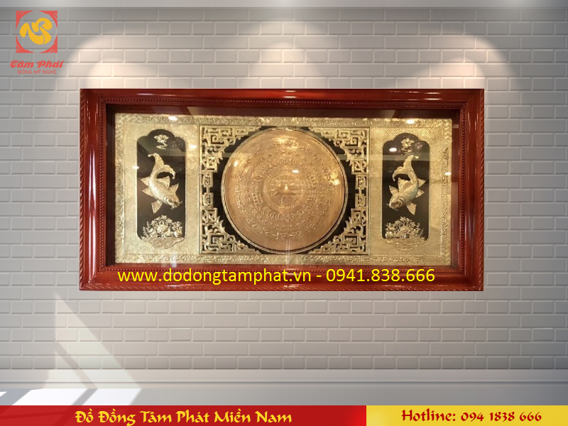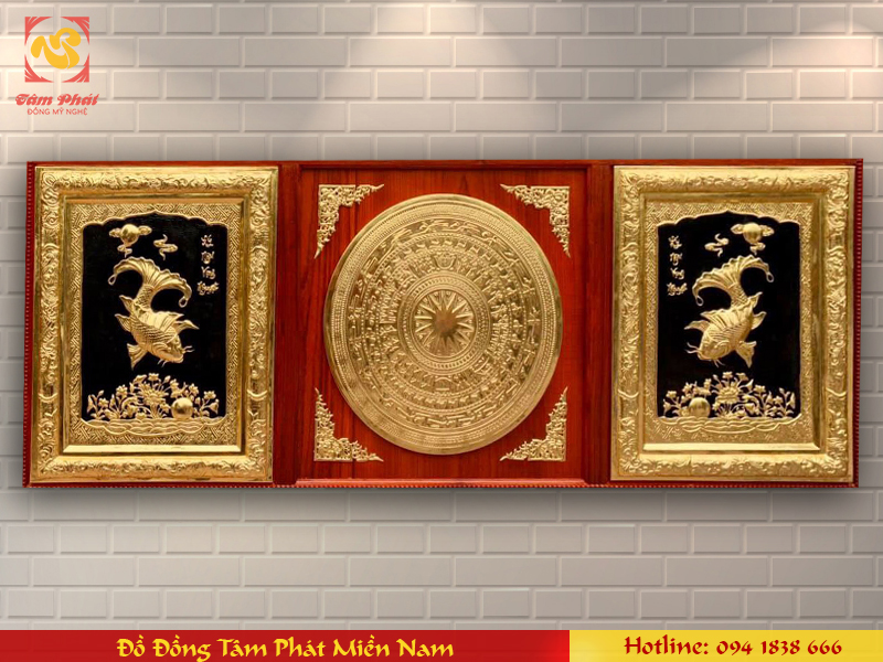 Tranh mặt trống đồng kết hợp Lý Ngư Vọng Nguyệt là bức tranh nội thất nghệ thuật đẹp về mặt trống đồng Việt Nam được khắc họa công phu, sâu sắc ý nghĩa phong thủy. Tác phẩm được Tâm Phát chế tạo kì công từ đồng nguyên chất và hoa văn tinh tế. Bức tranh được ưa chuộng trưng bày trong phòng làm việc, phòng khách với ý nghĩa phong thủy sâu sắc.