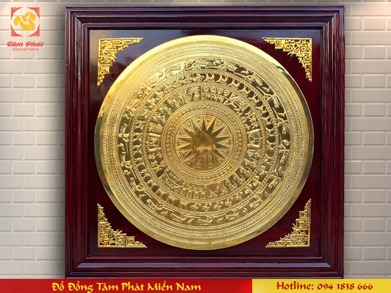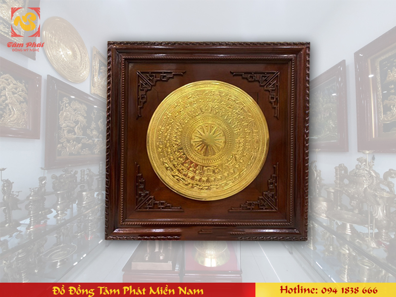 Tranh mặt trống đồng thếp vàng khung gỗ chạm cánh dơi