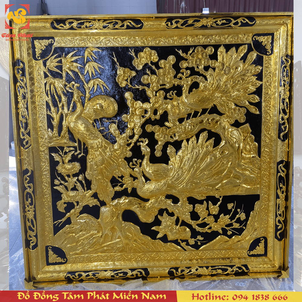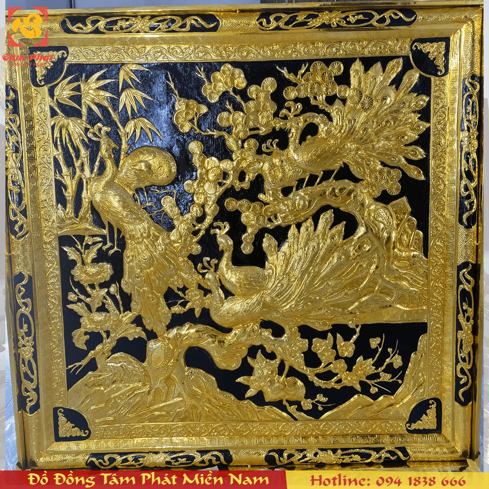 Trên vùng đất khô cằn, tất cả bốn loại cây đại diện cho Xuân Hạ Thu Đông đều hiện lên đầy sức sống. Ngoài ra, trong tranh Ngọc Đường Phú Quý, tác giả còn khéo léo đưa vào những đôi chim công. Sự xuất hiện của chúng mang lại nét đẹp mềm mại, duyên dáng cho tác phẩm. Chúng xòe bộ đuôi ra, trông rất giống những chiếc quạt lông vũ. Những chấm tròn trên bộ đuôi mang lại nét nổi bật. Không những thế, những đường viền xung quanh bức tranh cũng rất đẹp mắt. Phần khung liền đồng cũng được chạm Tùng Cúc Trúc Mai. Bên cạnh đó còn phải kể đến những cánh Dơi Phúc, các họa tiết hình học cách điệu. Ngoài ra, dodongtamphat.vn nhận chế tác mọi kích thước theo yêu cầu.