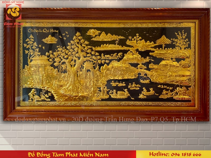 Bức tranh đồng quê bằng đồng ngoài các kích thước chính, sẵn có là: 2m3 x 1m15; 1m15 x 75cm; 1m75 x 90cm,... còn được chế tác theo yêu cầu của khách hàng. Bức tranh được làm từ đồng vàng hoặc đồng đỏ, khung gỗ tự nhiên (gỗ tùng, gỗ thông).