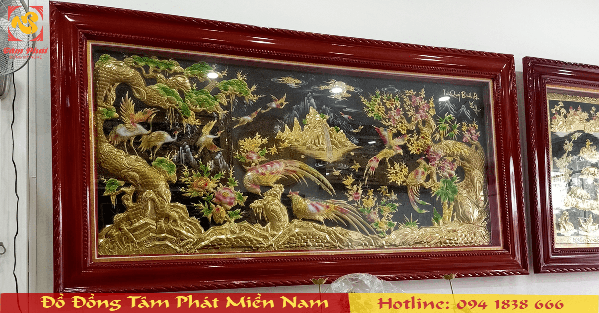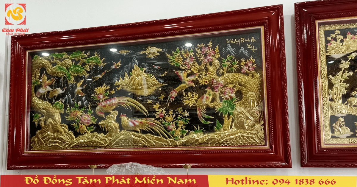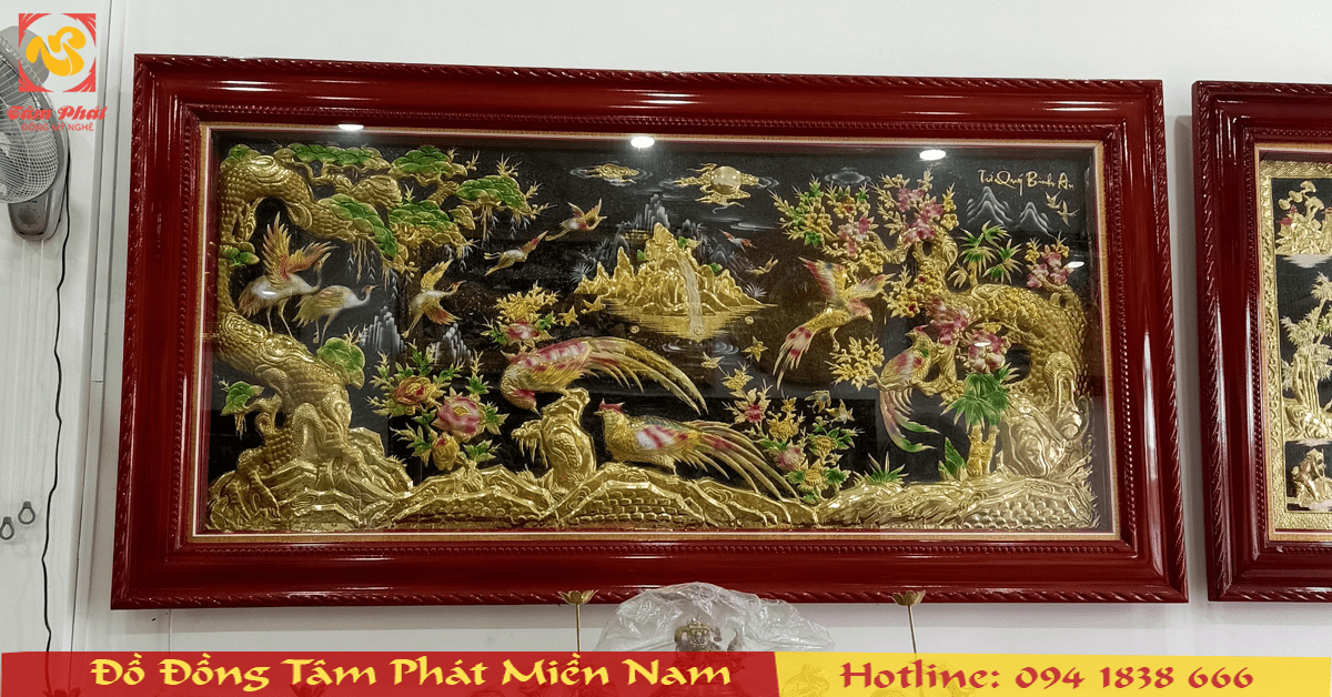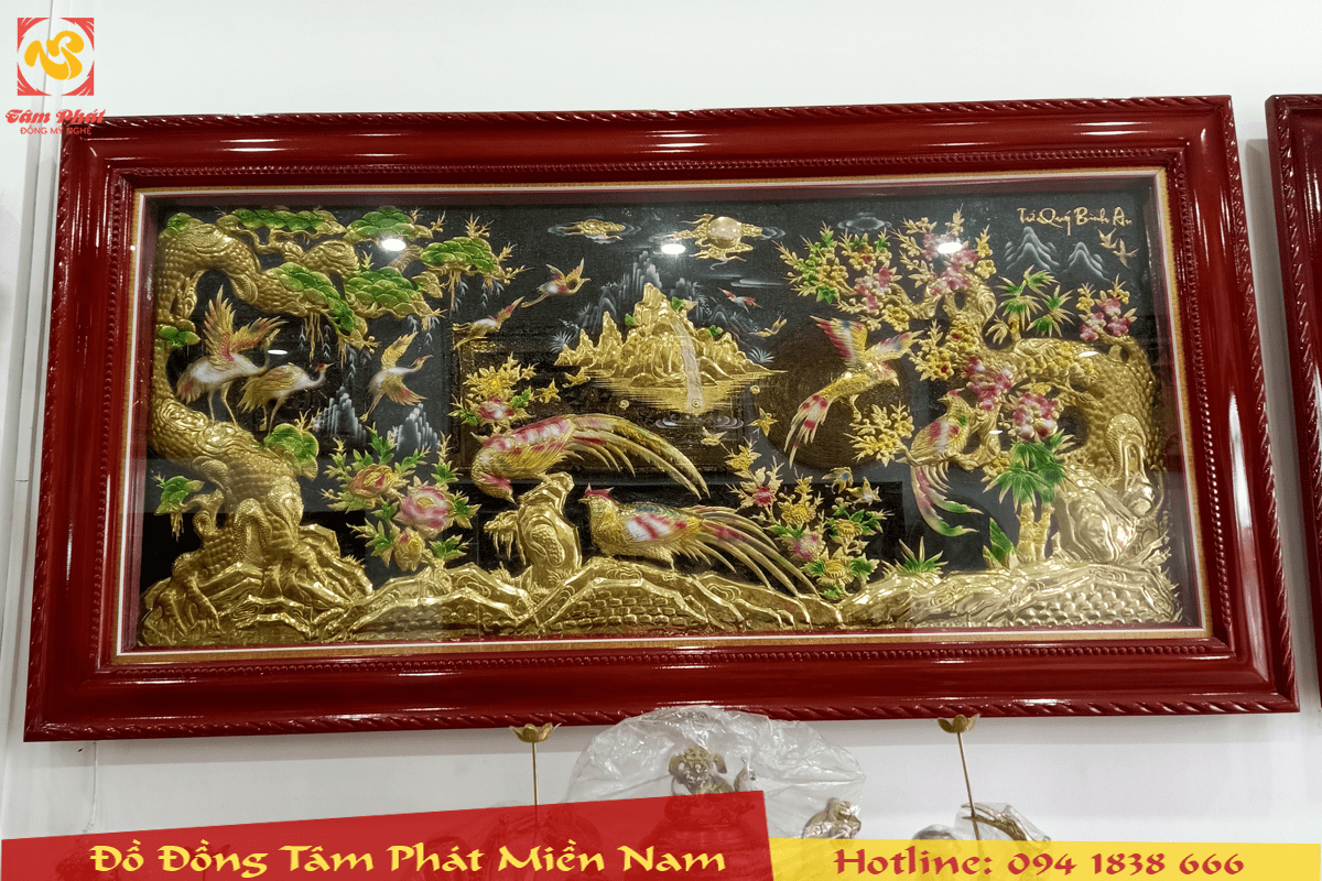Nguyên liệu: Nền tranh nguyên tấm đồng thiết kế giả cổ, khung gỗ tùng chống mối mọt