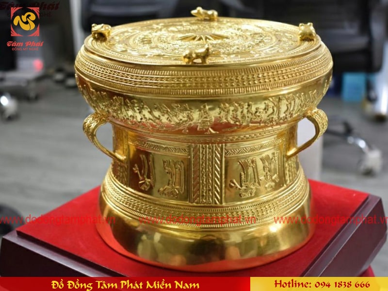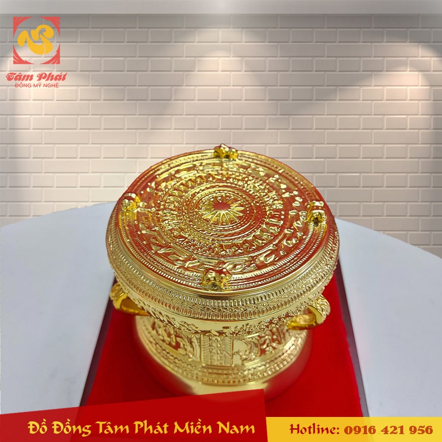 Giao quả trống đồng đồng đỏ D50cm dát vàng 9999 cho anh Công ở Q7, TPHCM