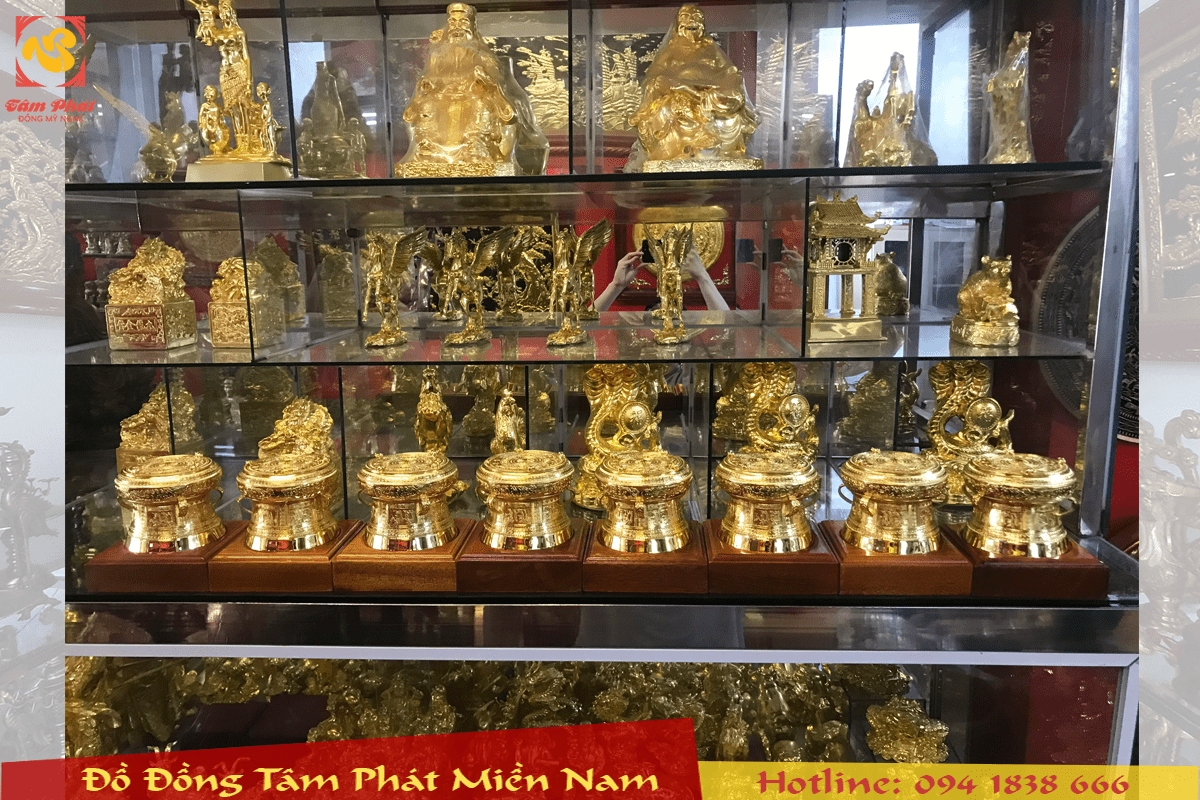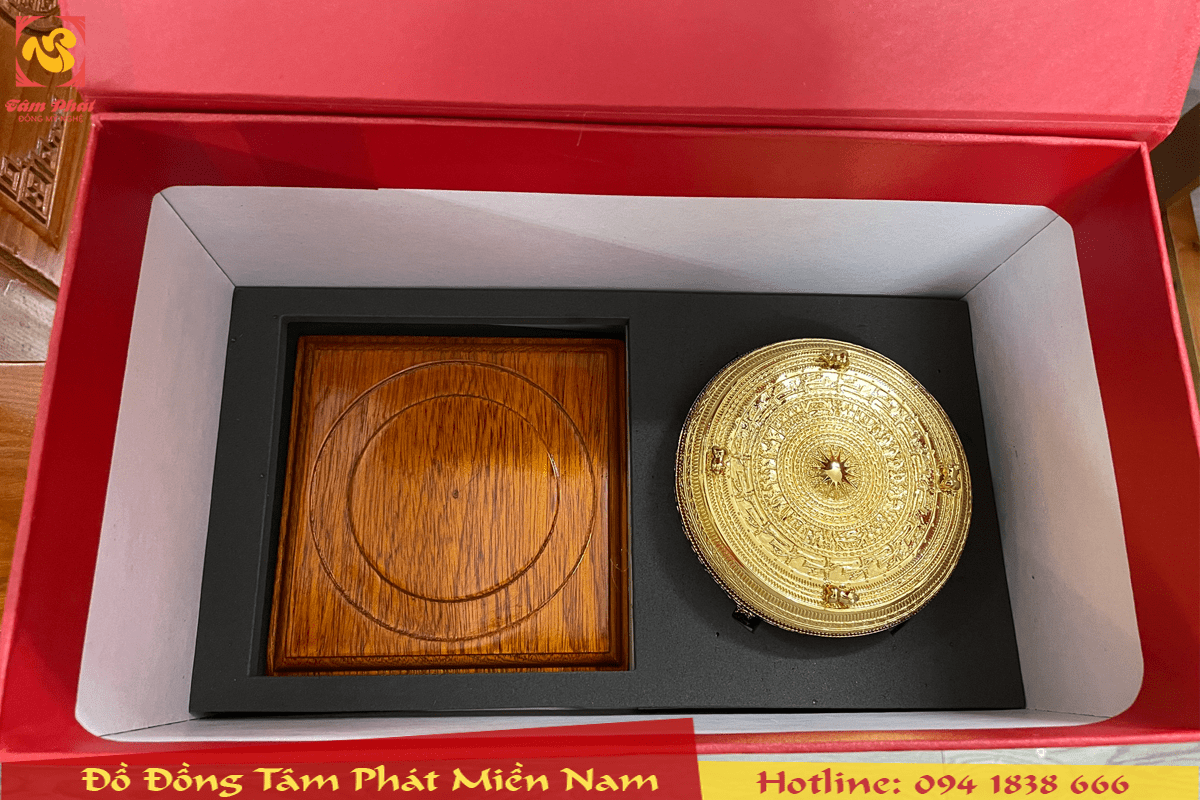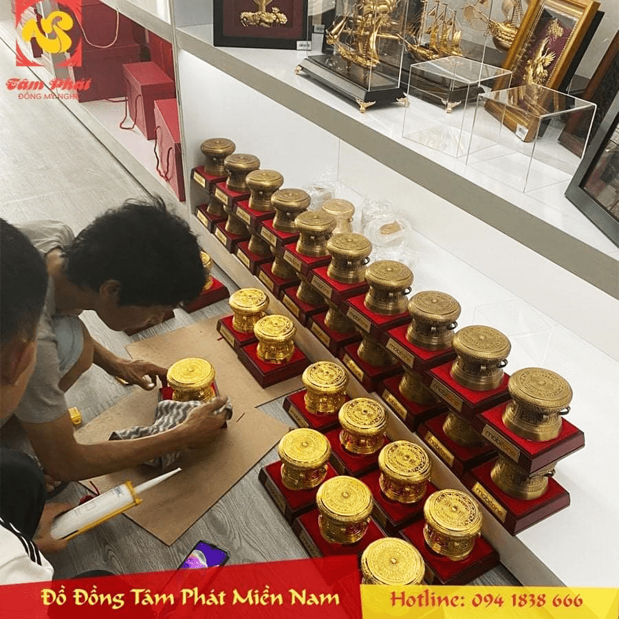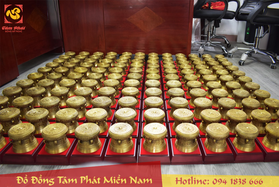 Khác với các loại mô hình trống đồng trên giá đỡ hoa sen khác trên thị trường thì trống đồng của Đồ Đồng Tâm Phát Miền Nam được mạ vàng thật bằng phương pháp điện phân hiện đại. Trải qua hơn 20 công đoạn chế tác nghiêm ngặt, bằng sự nhiệt tâm và qua đôi bàn tay khéo léo của các nghệ nhân, quà vàng mang trong mình vẻ đẹp tinh xảo và sang trọng.