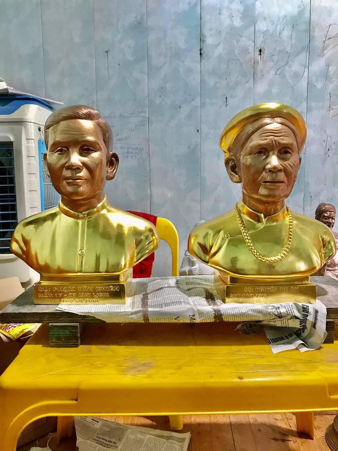 Tượng chân dung cụ ông cụ bà bằng đồng dát vàng 9999 tại xưởng