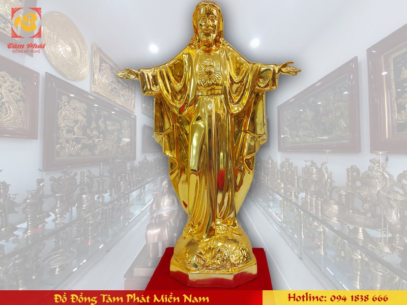 Mặt chính diện của bức tượng, các bạn có thể thấy chi tiết trái tim tỏa ánh hào quang và cây Thánh giá. Đó chính là Thánh Tâm của Chúa! Từ những chi tiết thể hiện biểu cảm đến bề mặt nhẵn mịn, ánh hoàng kim toát lên đầy cuốn hút.