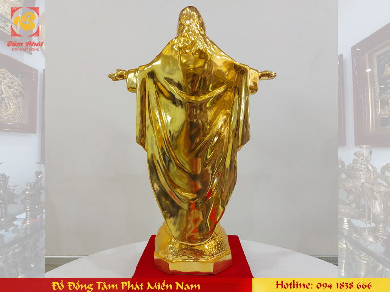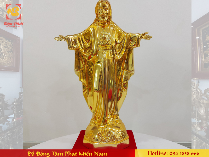 Mục đích sử dụng: Tượng Đức Chúa Giêsu dang tay bằng đồng dát vàng 9999 là bức tượng đồng công giáo đẹp tôn nghiêm, giàu ý nghĩa sâu sắc rất được ưa chuộng. Tác phẩm được Tâm Phát chế tạo kì công từ đồng nguyên chất với màu sắc, hoa văn tinh tế cùng những nét chạm đúc công phu, sâu sắc tính thẩm mỹ và giá trị nhân văn. Tác phẩm được sử dụng nhiều trong các nhà thờ hay các hoạt động công giáo với ý nghĩa sâu sắc.