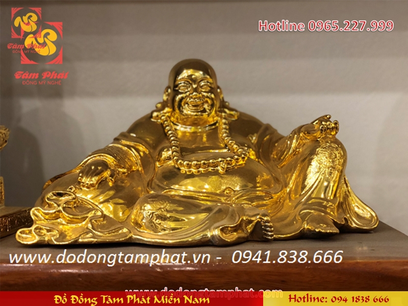 Tượng ông Di Lặc ngồi bằng đồng thếp vàng cao 30cm là bức tượng Phật cao cấp, linh thiêng, giàu ý nghĩa rất được ưa chuộng. Tác phẩm được Tâm Phát chế tạo kì công từ đồng nguyên chất với màu sắc, hoa văn tinh tế cùng những nét chạm đúc công phu, sâu sắc giá trị nhân văn. Bức tượng thường được sử dụng trưng bày trong cơ quan, phòng khách nhằm mang lại may mắn cho gia chủ…