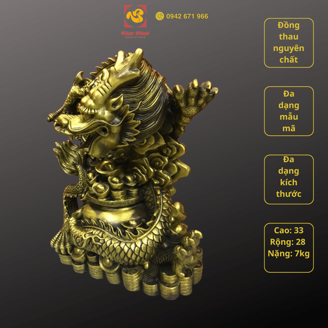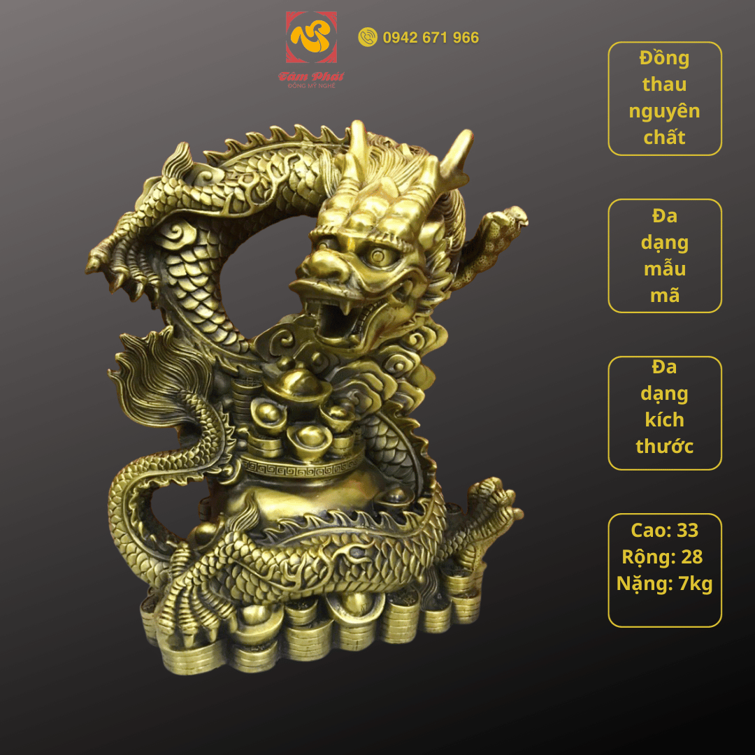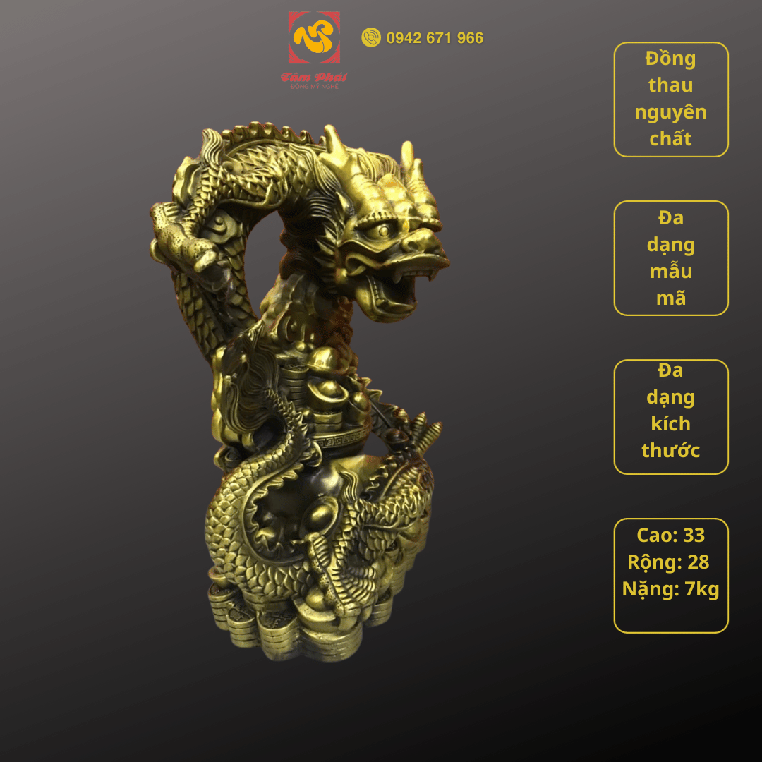 Tượng rồng bằng đồng - linh vật phong thủy ý nghĩaMục đích sử dụng: Tượng rồng bằng đồng là sản phẩm mỹ nghệ nằm trong hệ thống 12 con giáp. Sản phẩm đẹp tinh xảo, giàu ý nghĩa rất được ưa chuộng. Tác phẩm được Tâm Phát chế tạo kì công từ đồng nguyên chất với màu sắc, hoa văn tinh tế cùng những nét chạm đúc công phu, đậm đà giá trị nghệ thuật. Sản phẩm thường được dùng trưng bày trong phòng khách, phòng làm việc, phòng họp cơ quan với ý nghĩa phong thủy sâu sắc.