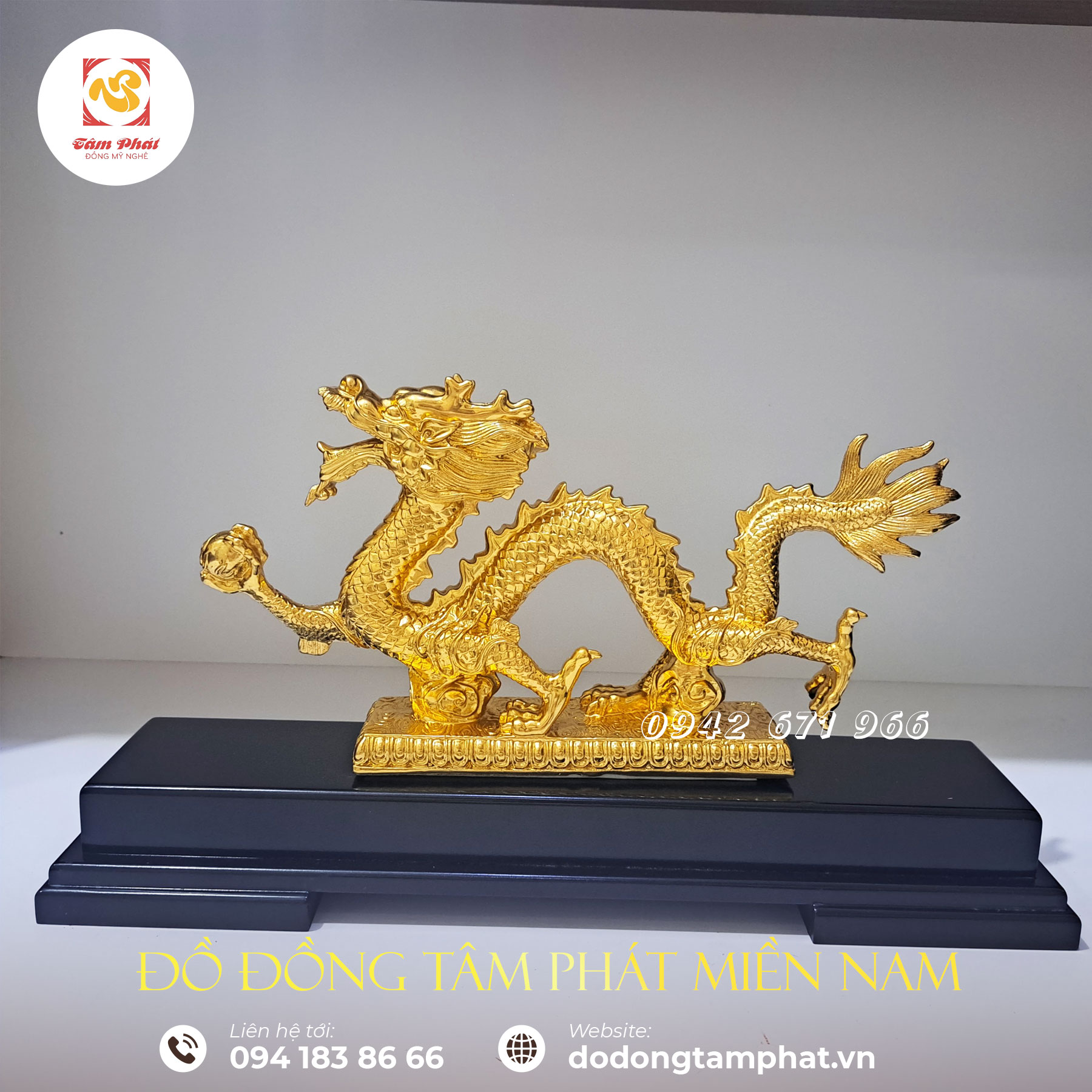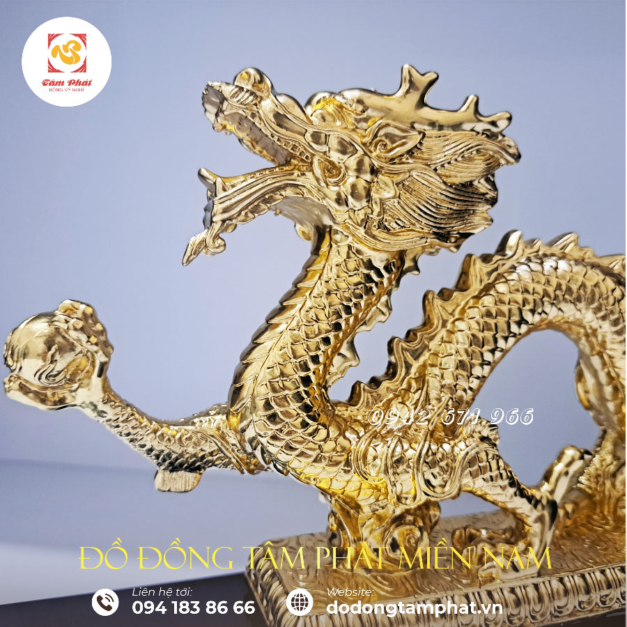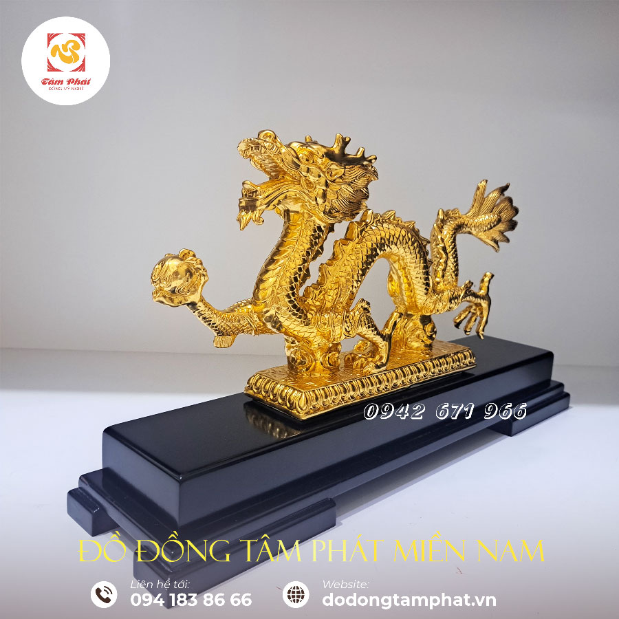 Mục đích sử dụng: Tượng rồng cầm ngọc bằng đồng mạ vàng là sản phẩm mỹ nghệ nằm trong hệ thống 12 con giáp. Sản phẩm đẹp tinh xảo, giàu ý nghĩa rất được ưa chuộng. Tác phẩm được Tâm Phát chế tạo kì công từ đồng nguyên chất với màu sắc, hoa văn tinh tế cùng những nét chạm đúc công phu, đậm đà giá trị nghệ thuật. Sản phẩm thường được dùng trưng bày trong phòng khách, phòng làm việc, phòng họp cơ quan với ý nghĩa phong thủy sâu sắc.