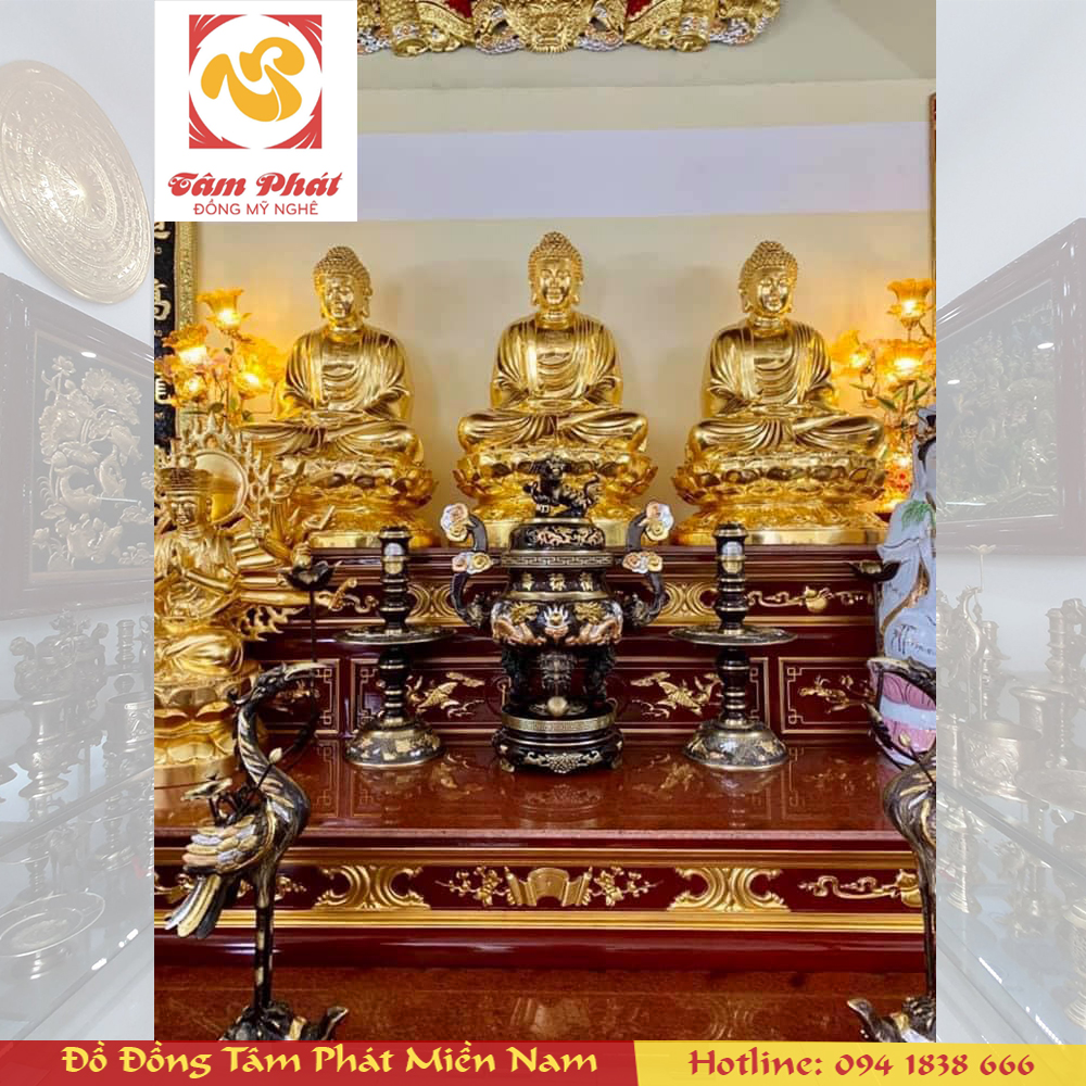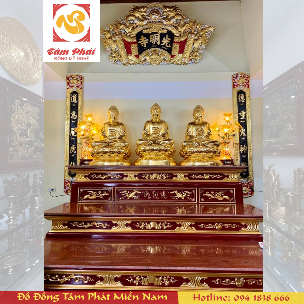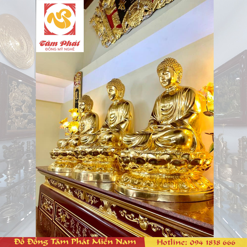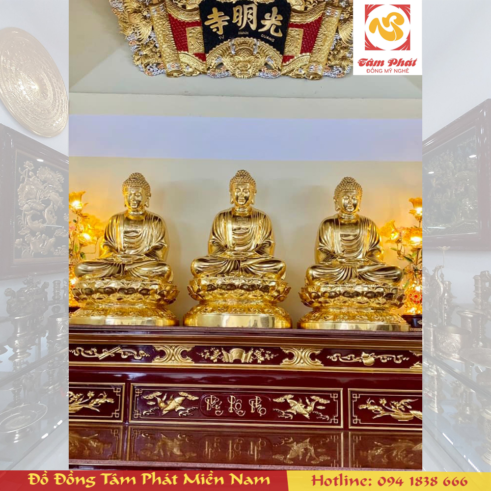 Tượng Tam Thế Phật cao 1m08 - Đúc bằng đồng đỏ nguyên khối, được Dát vàng 9999 nặng 180kg 1 tượng