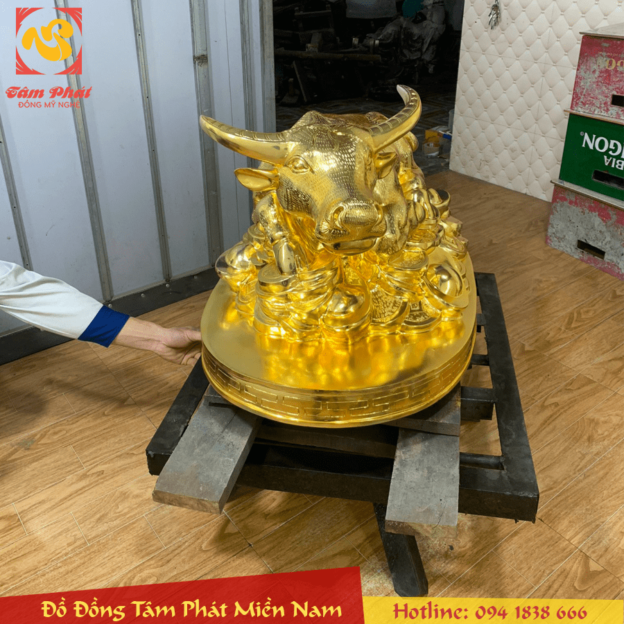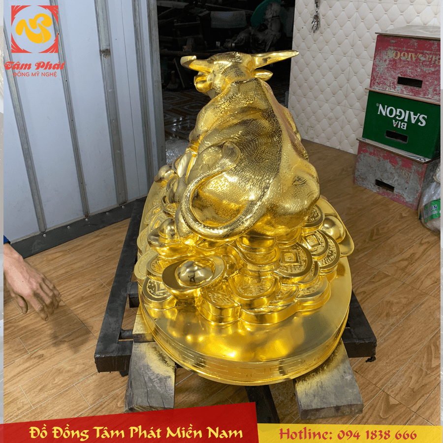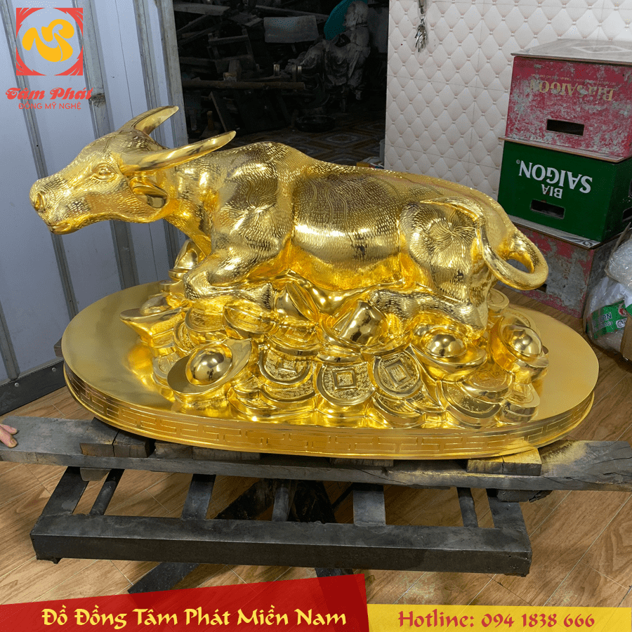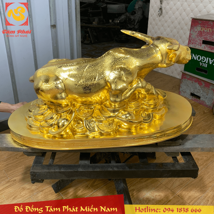 Tượng trâu đồng phong thủy nằm trên vàng bạc châu báo dát vàng 9999